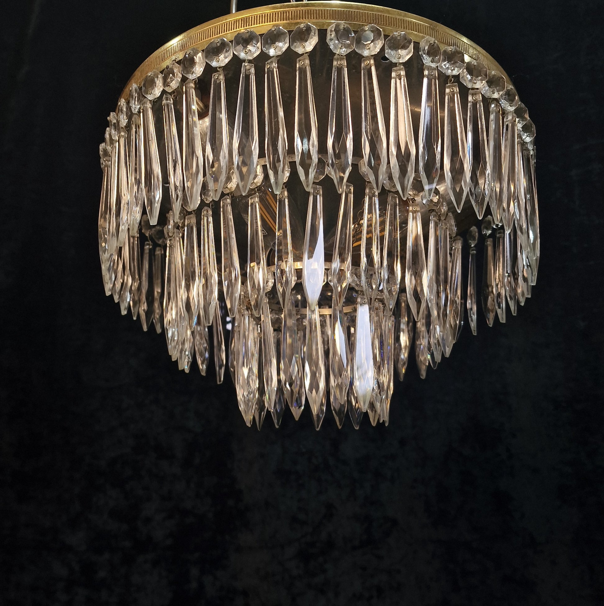 The Chandelier is in Good Condition for its age although there is a few nicks and nibbles to some of the crystals tips, which is normally expected with this type of light fixture.
