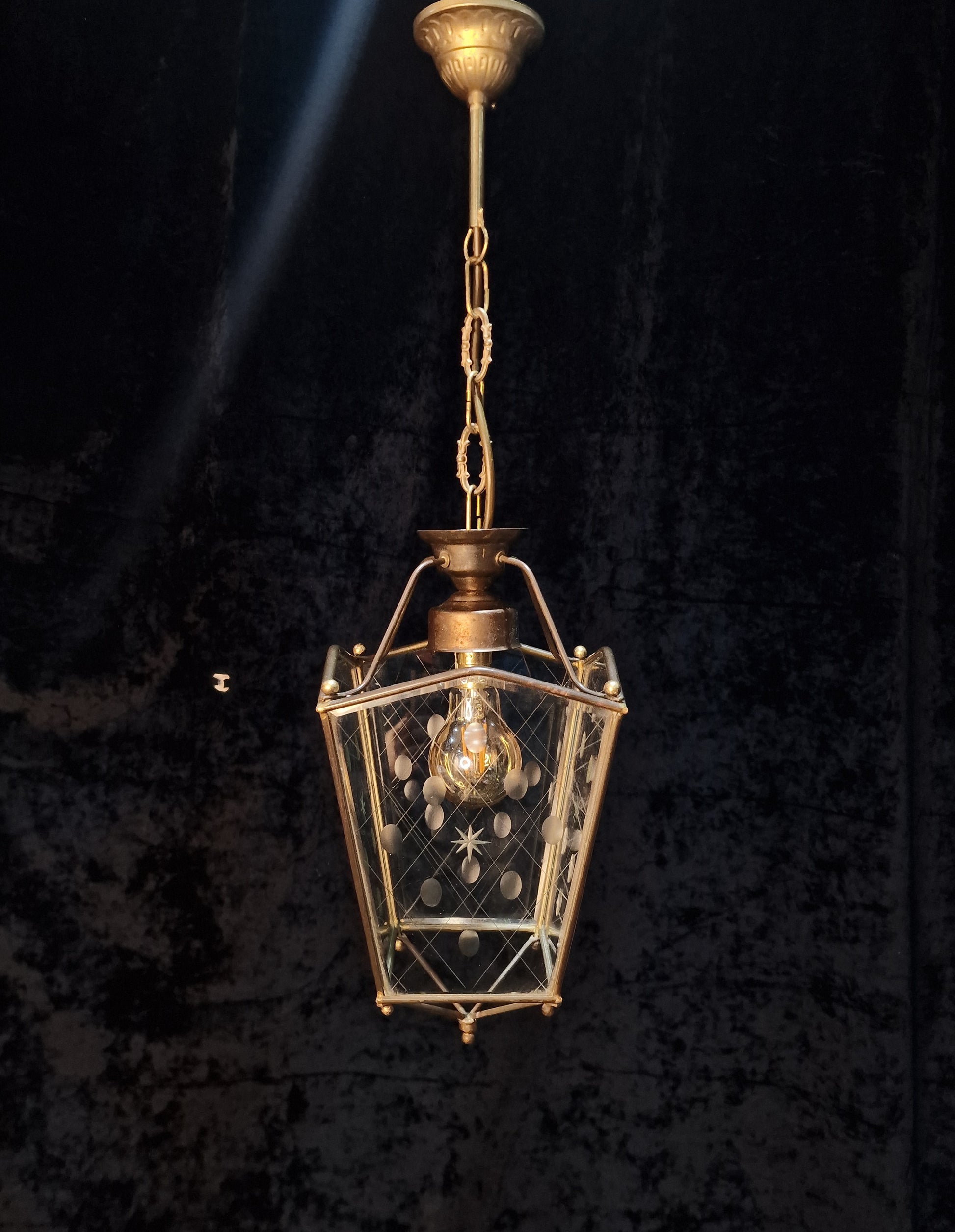 Classical Vintage French 1 Light Brass Bevelled Cut Glass Lantern Ceiling Light