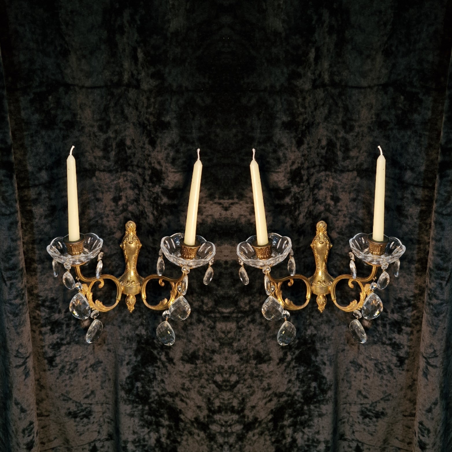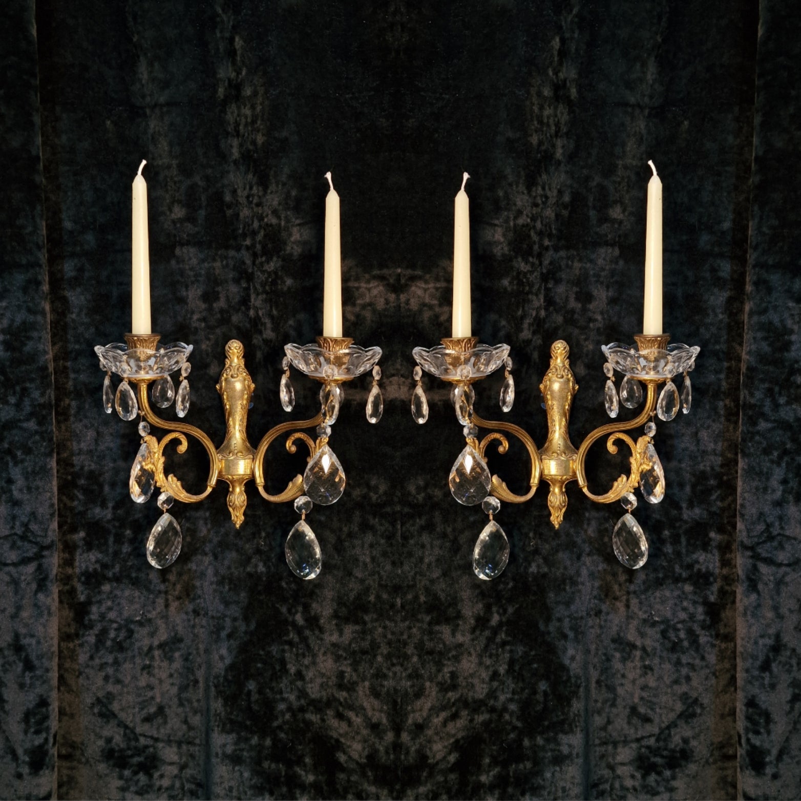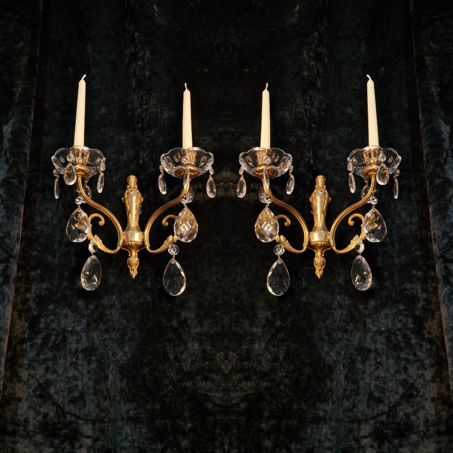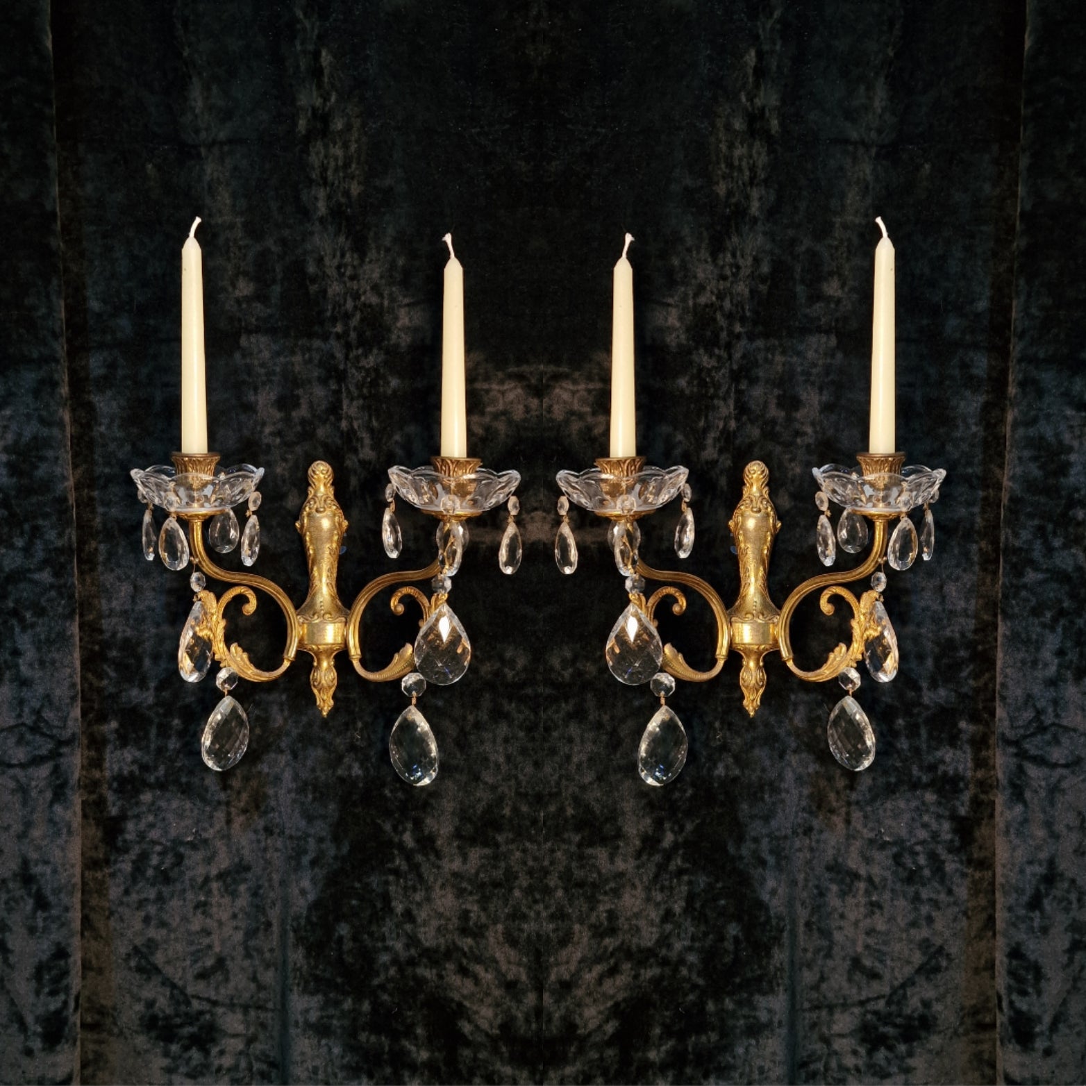 Elegant Pair Antique French 2 Arm Leaf Candle Crystal Brass Wall Lights Sconces