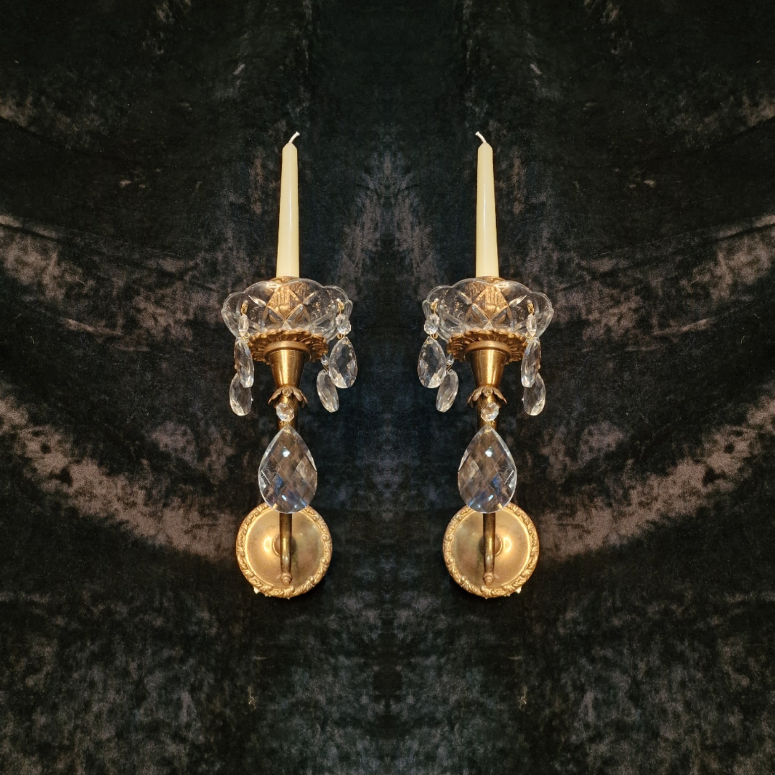 These sconces are in lovely condition for their age, and come complete with restored sparkling glass crystals and glass bobeche dishes, with no damage.