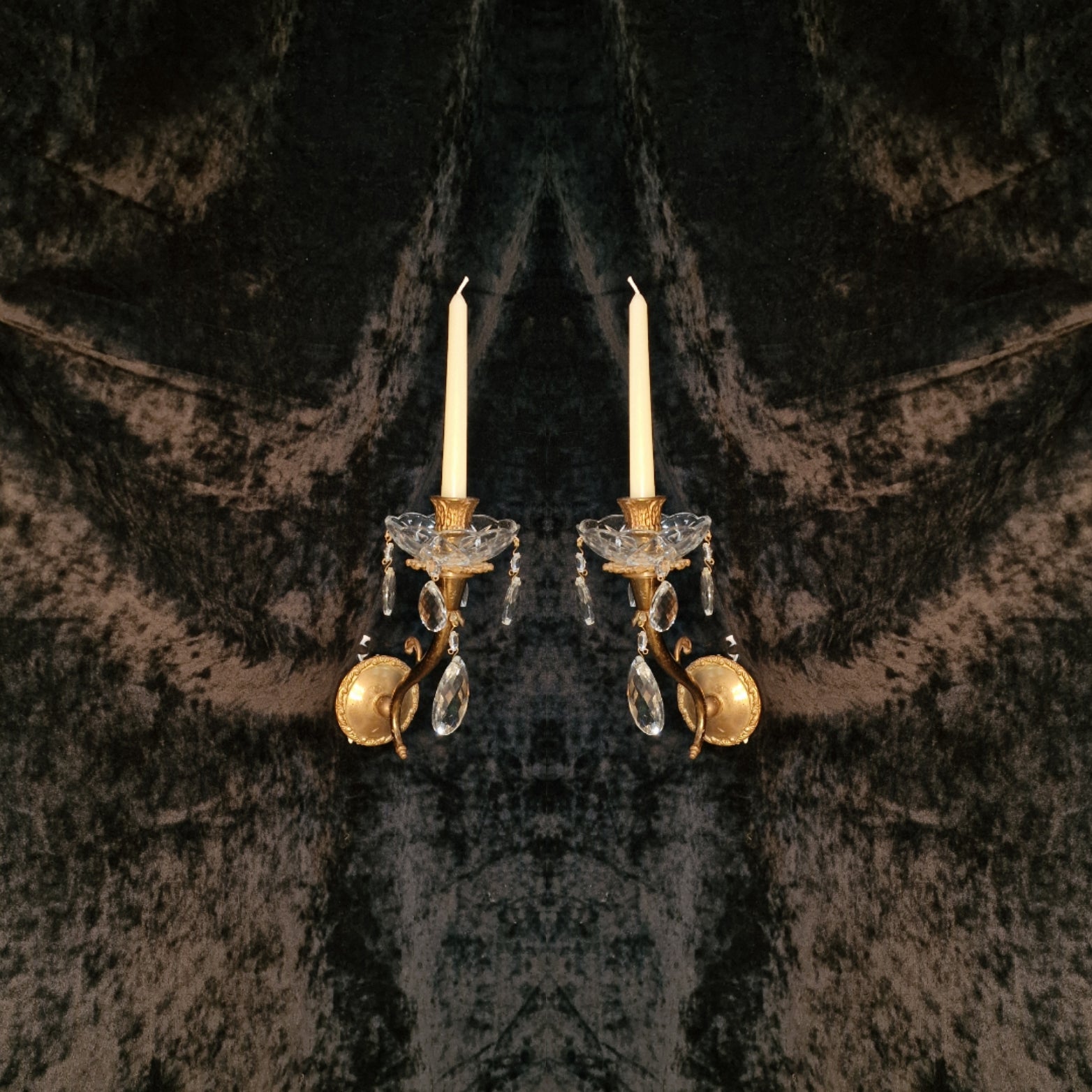 This elegant pair of vintage candle wall lights are from Italy. They have lovely intricate detailing complete with glass sparkling crystals and glass bobeche dishes.