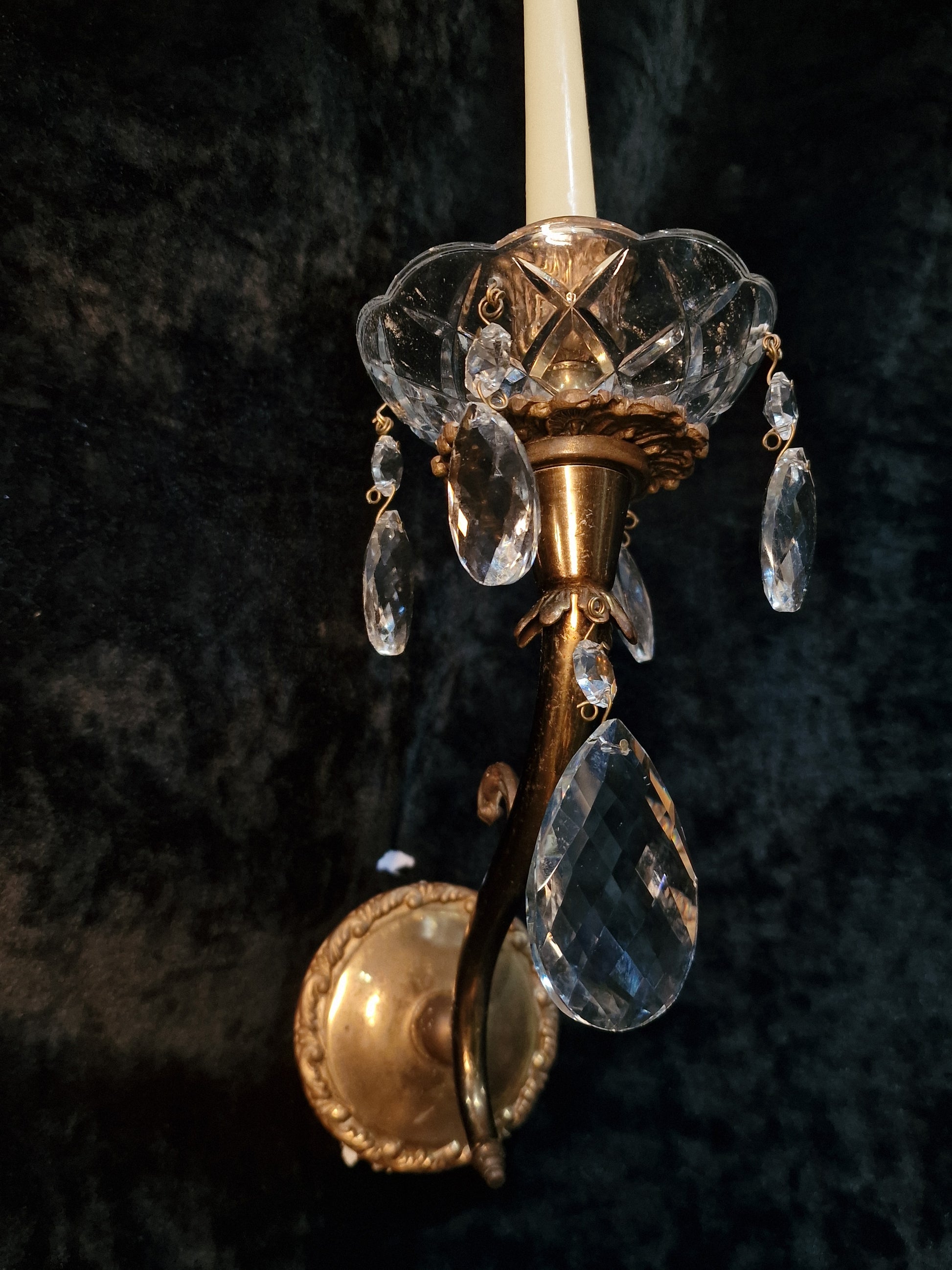 Elegant Pair Vintage Italian 1 Arm Crystal Brass Candle Wall Lights Sconces