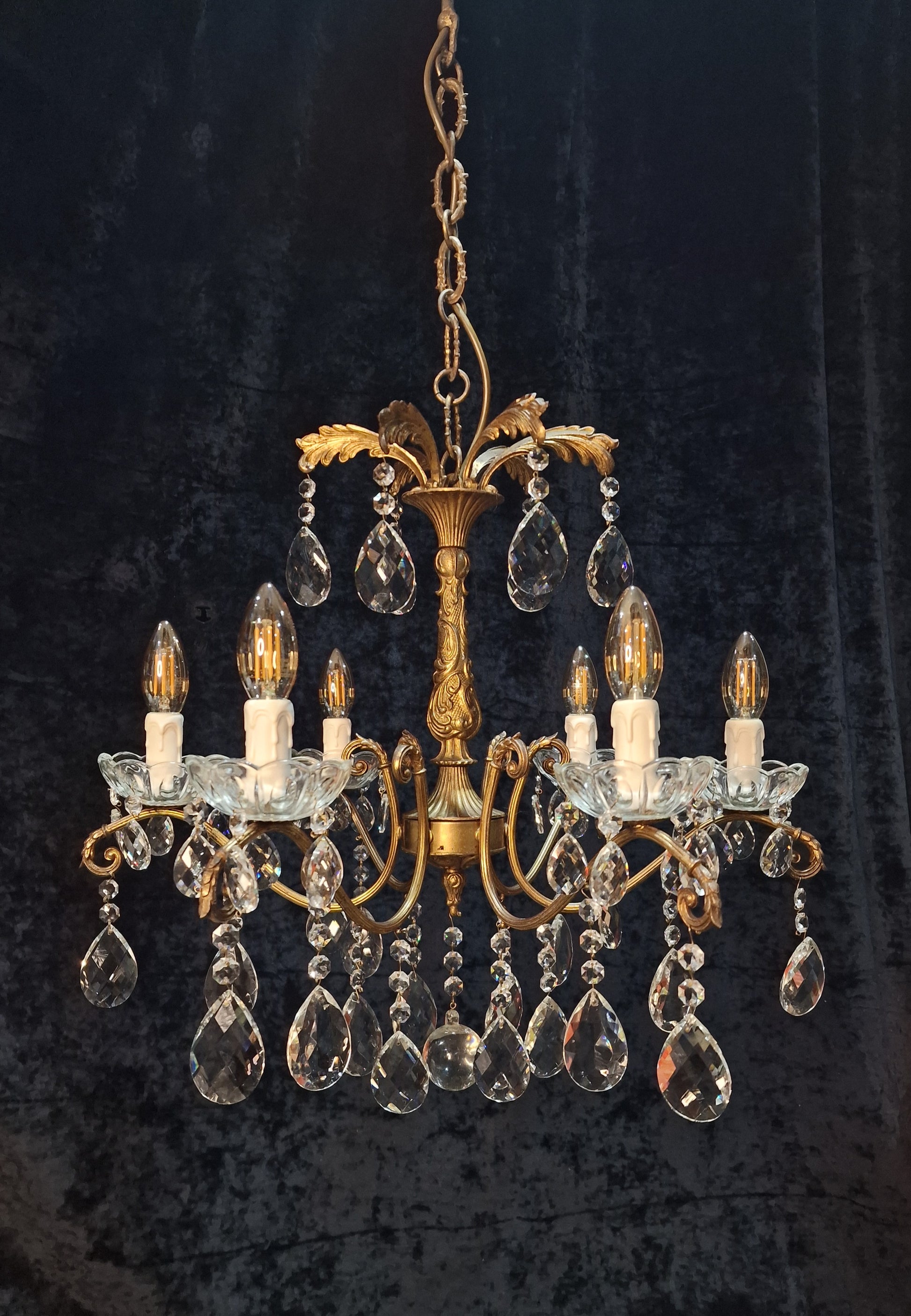 Fabulous Antique French 6 Arm Heavy Brass Crystal Leaf Chandelier Ceiling Light