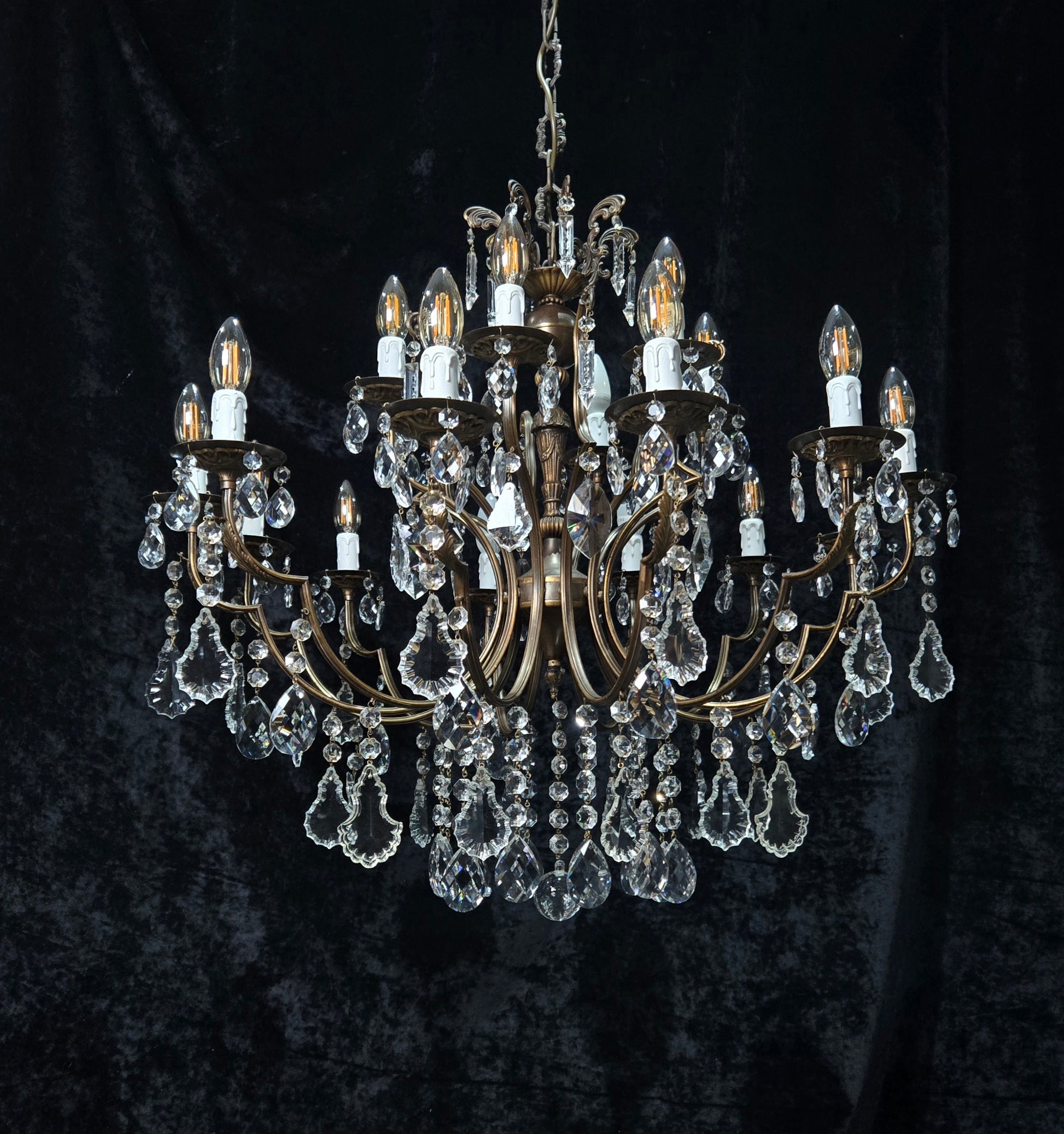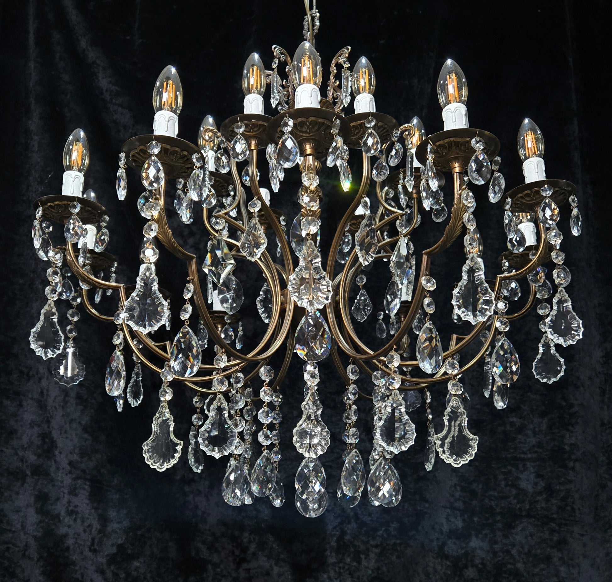 Fabulous Large Vintage Italian 12 Arm 18 Light Brass Crystal Leaf Chandelier