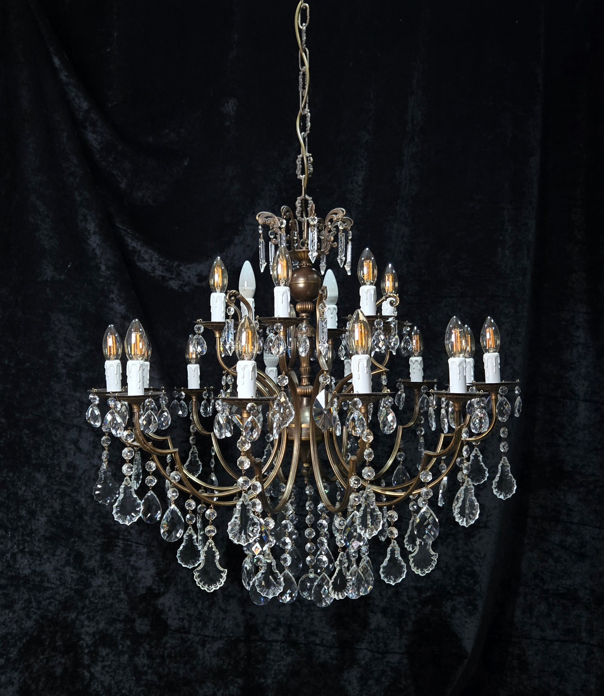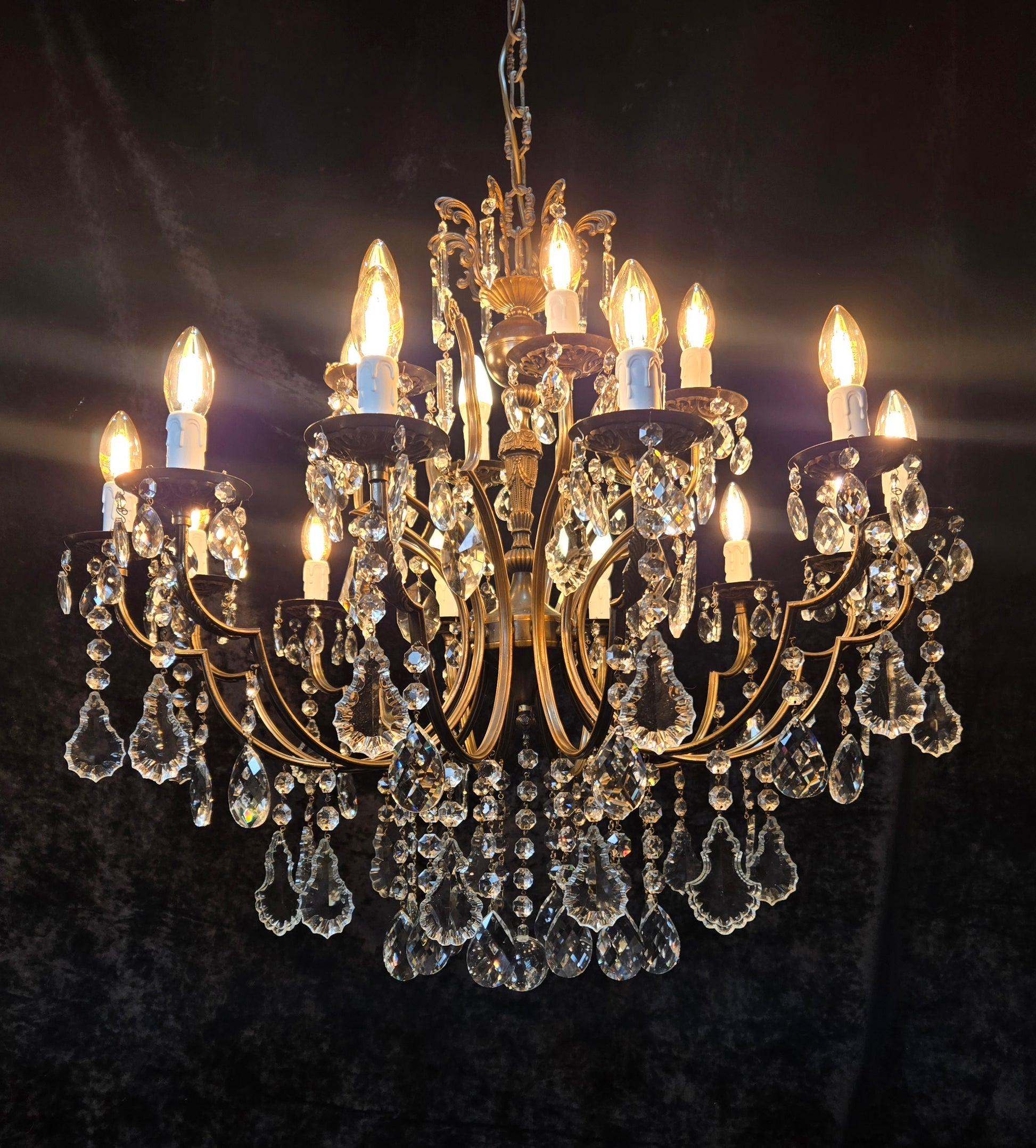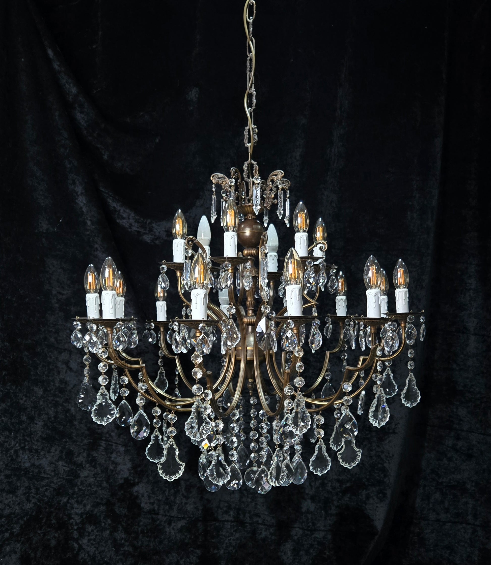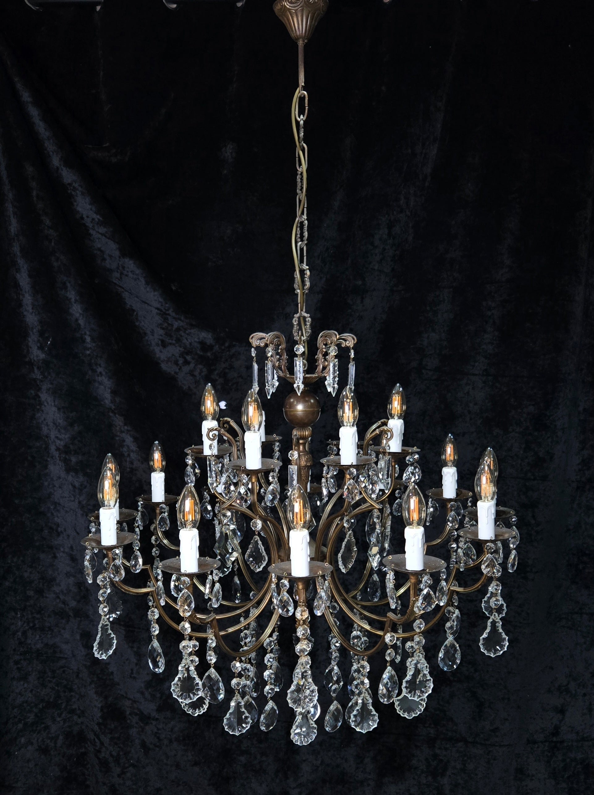The chandelier is complete with beautiful glass crystals which are all complete and in good condition for their age, although there is some small nicks and nibbles to some of the shield crystals.