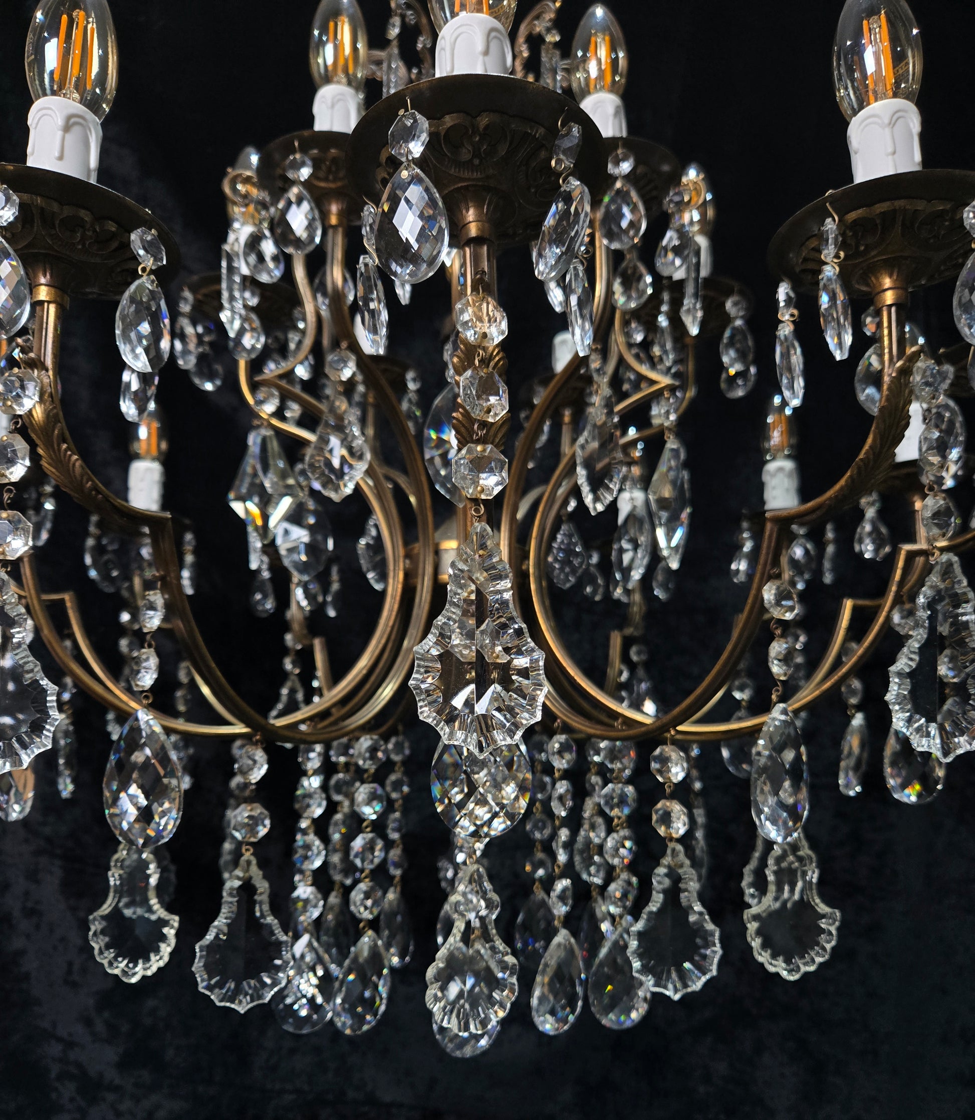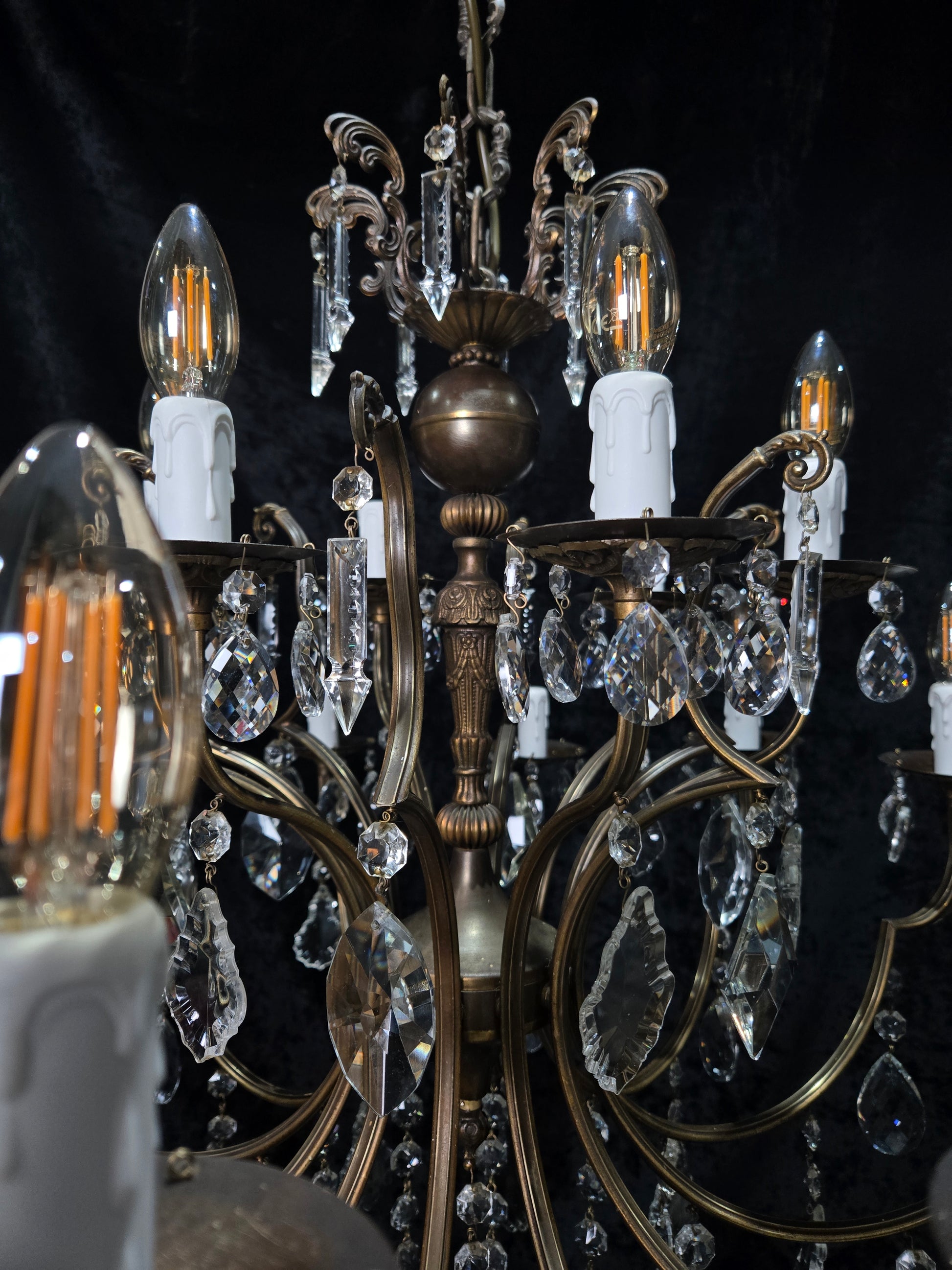 The chandelier has lovely detailing to the brass frame, with leaf embellishments and a large variety of sparkling glass crystals including shield crystals, faceted almond crystals, spear drop crystals and a large crystal ball.