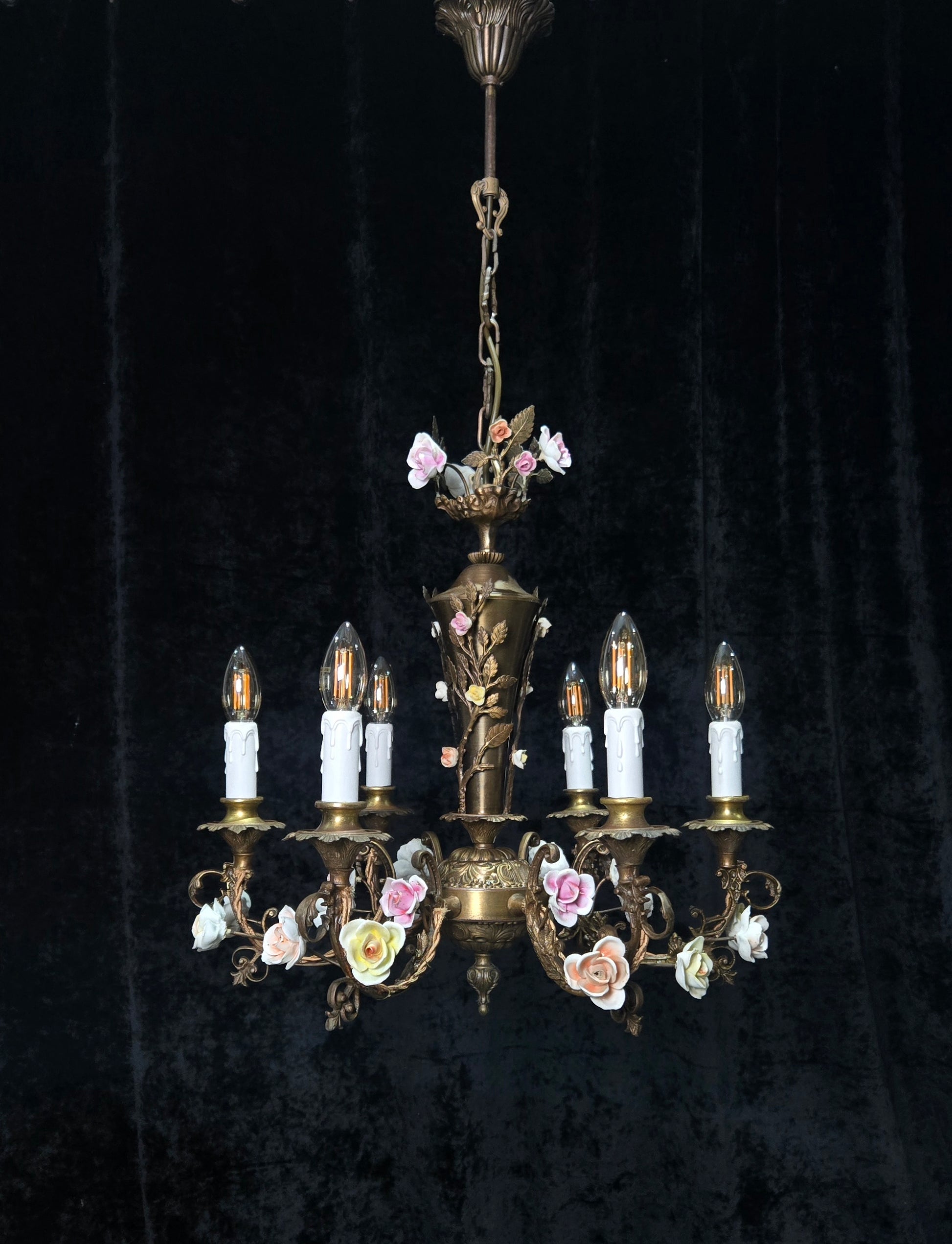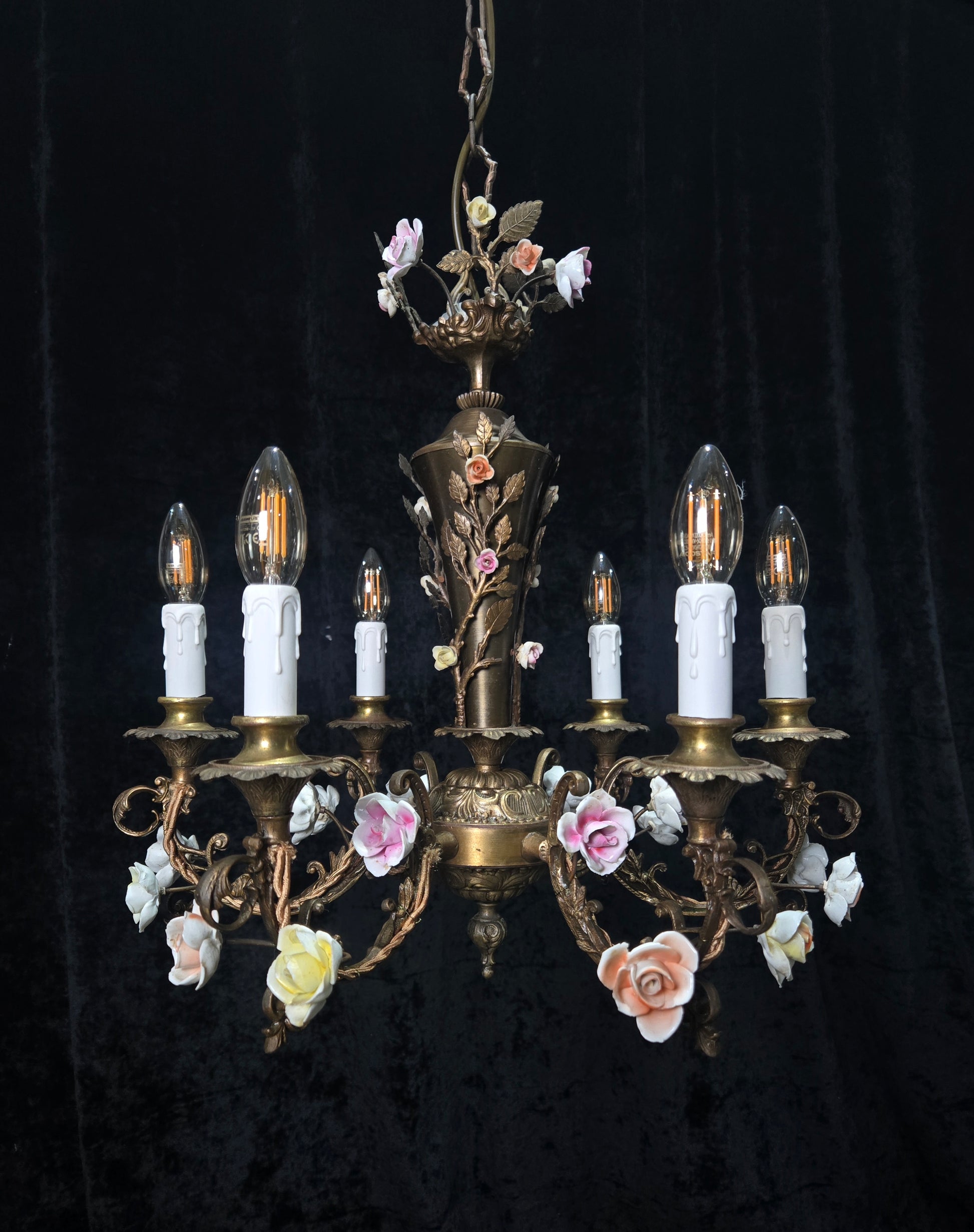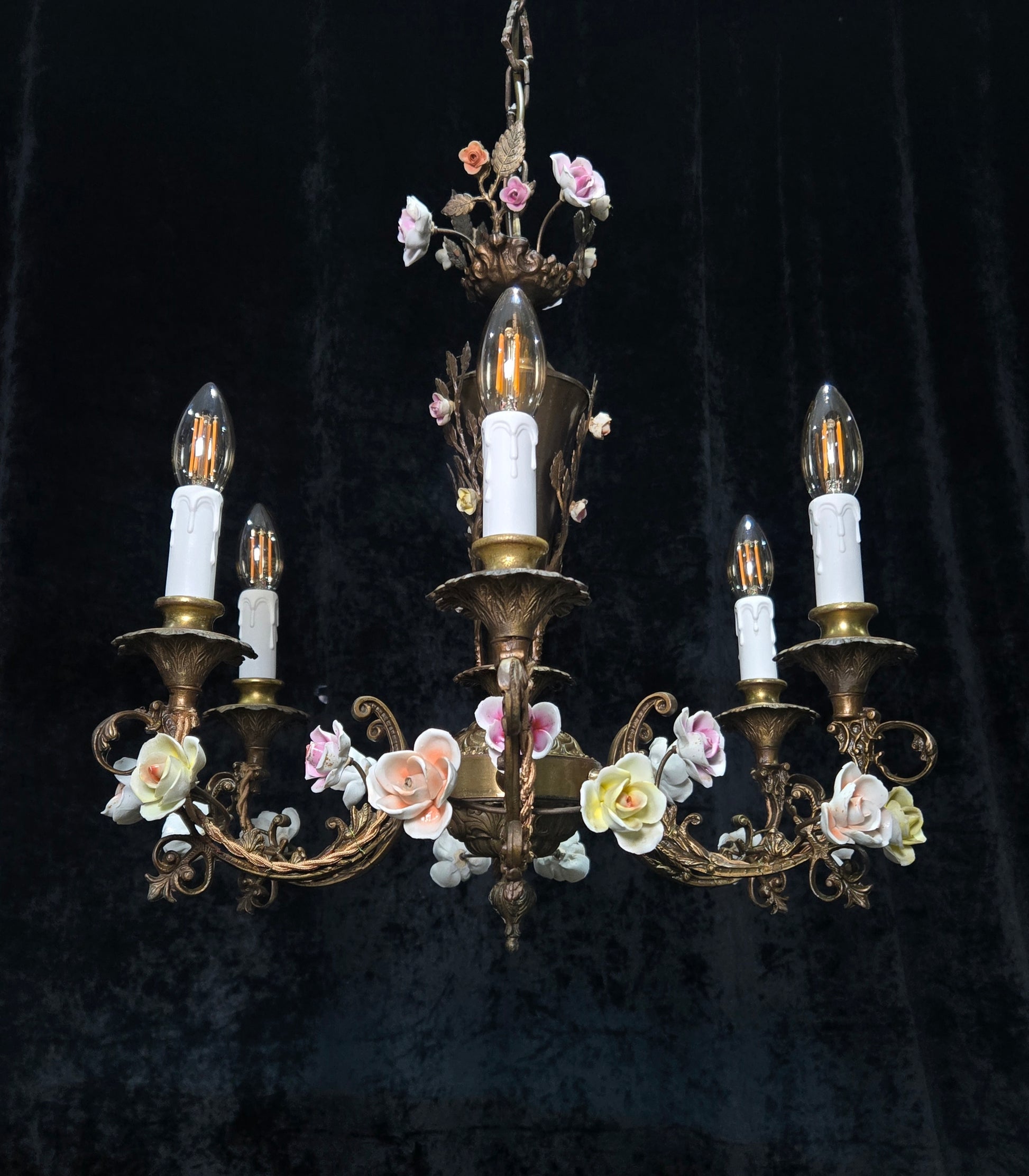 A beautiful colourful variety of hand painted porcelain roses throughout which are all complete and original to the chandelier.