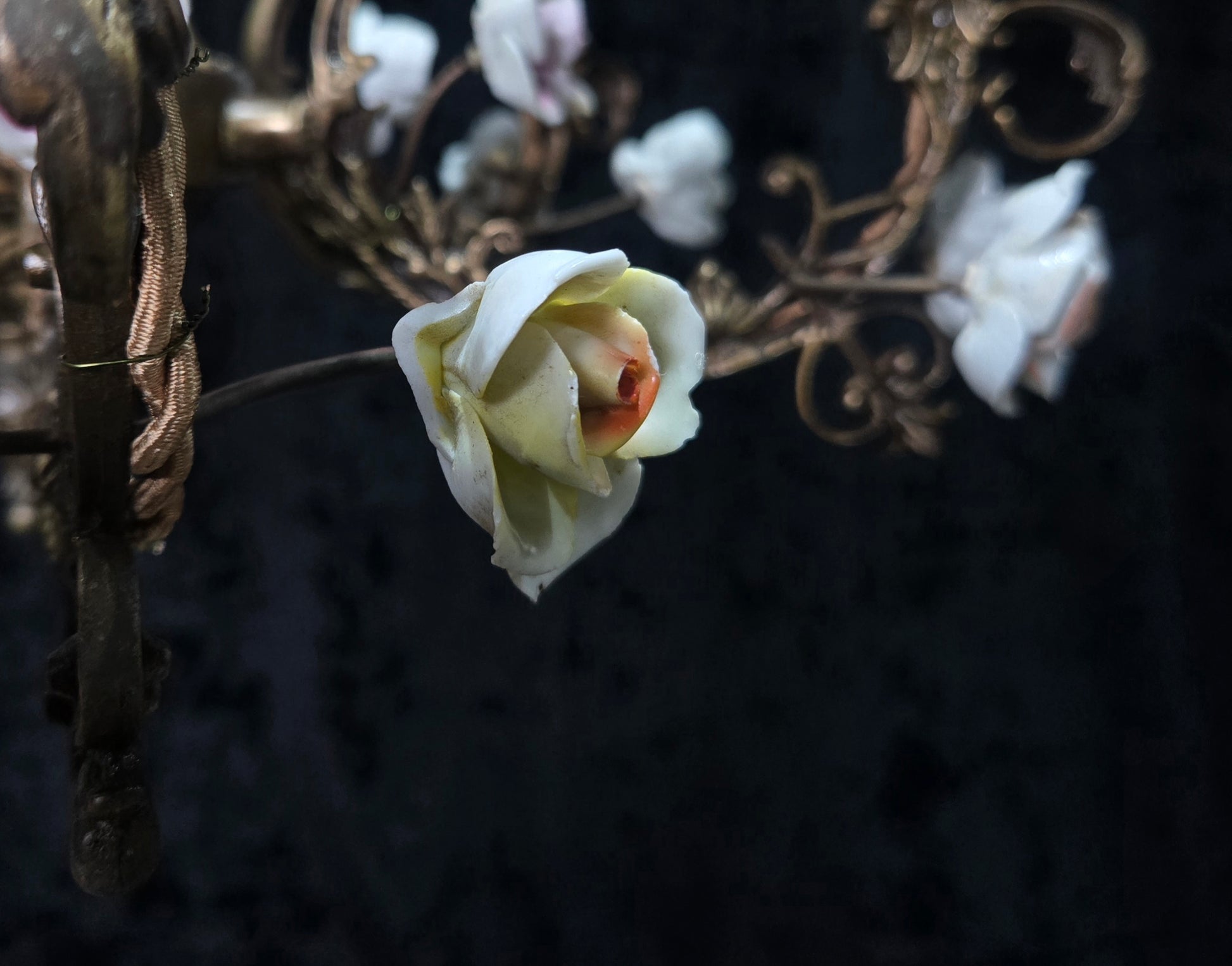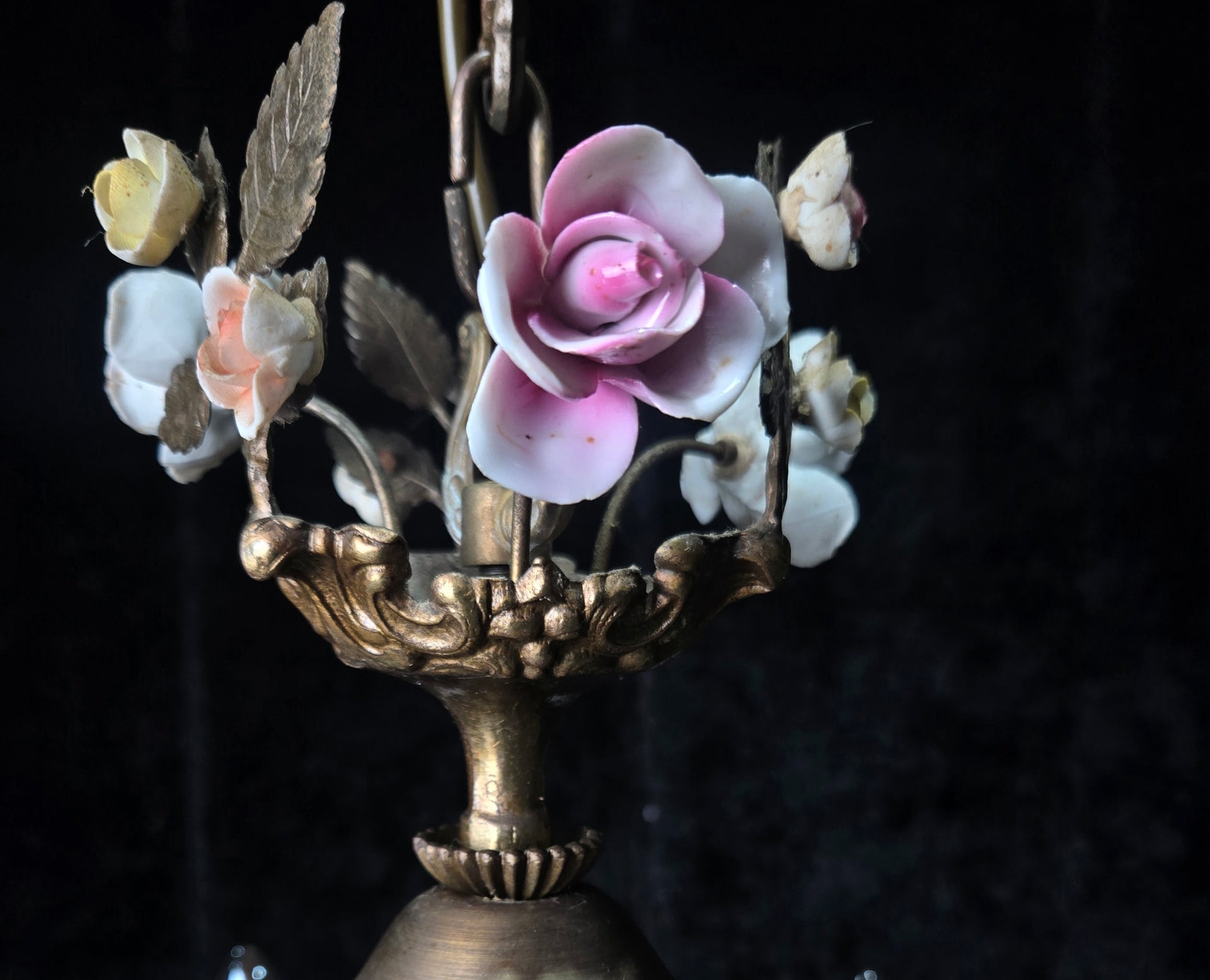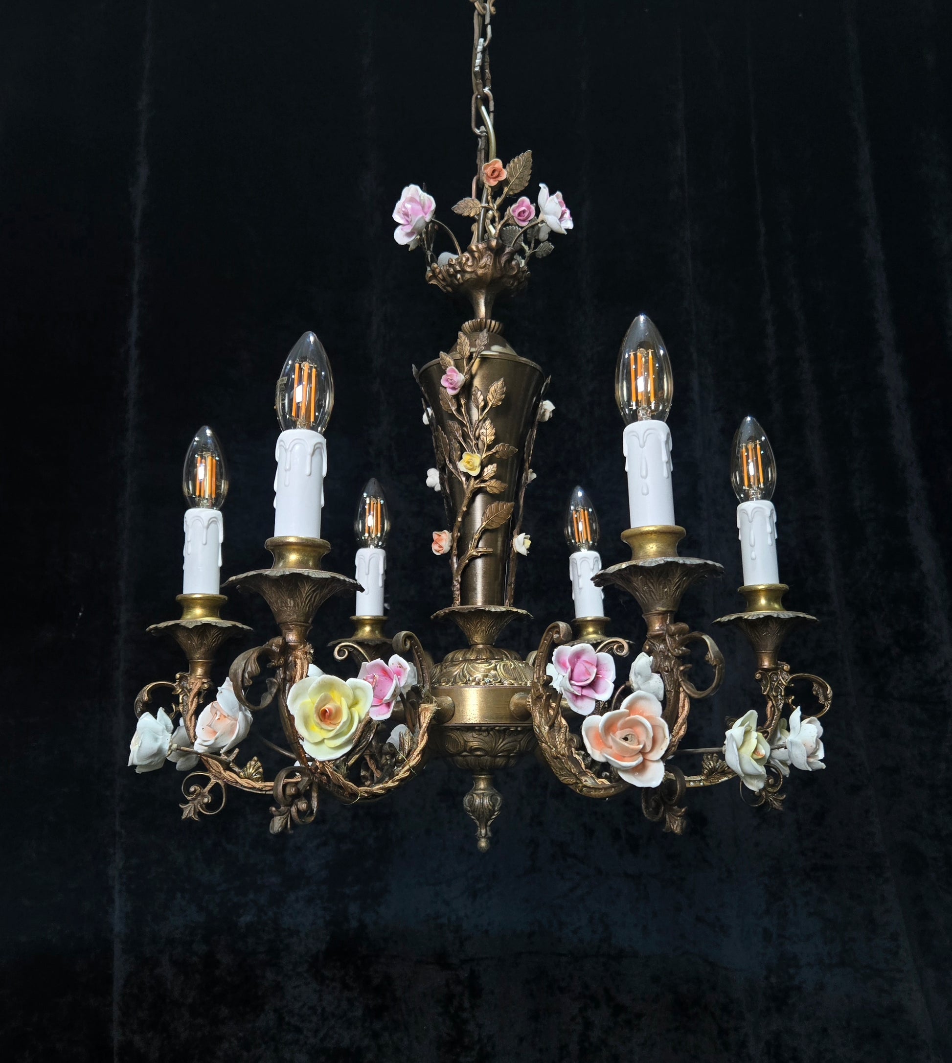 A beautiful colourful variety of hand painted porcelain roses throughout which are all complete and original to the chandelier.