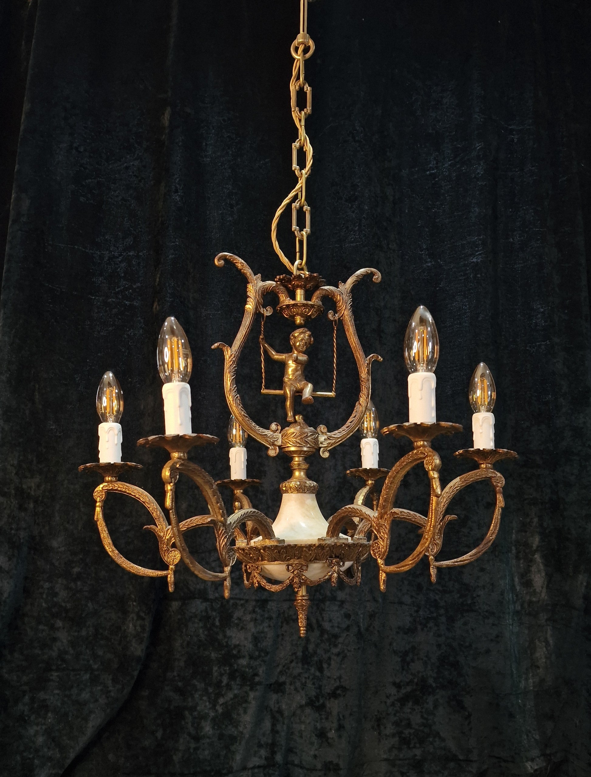 A truly beautiful and unusual chandelier from Spain. Complete with intricate detailing throughout with a foliage motif and a cherub on a swing to the centre of the chandelier.