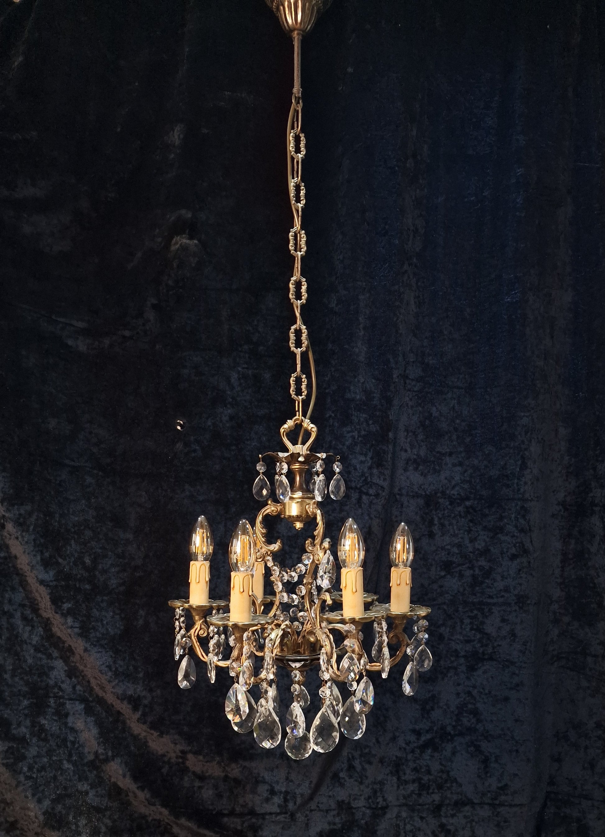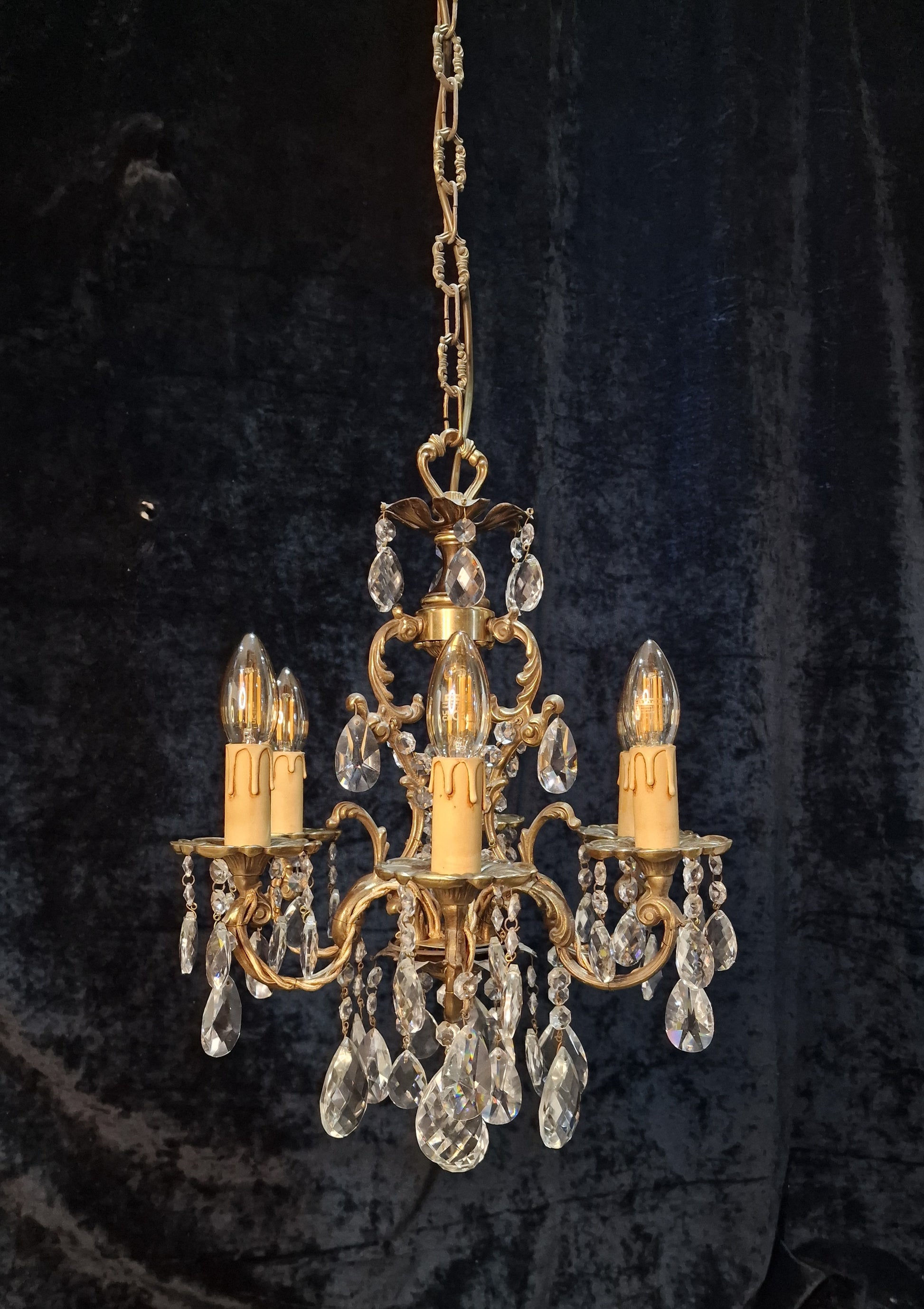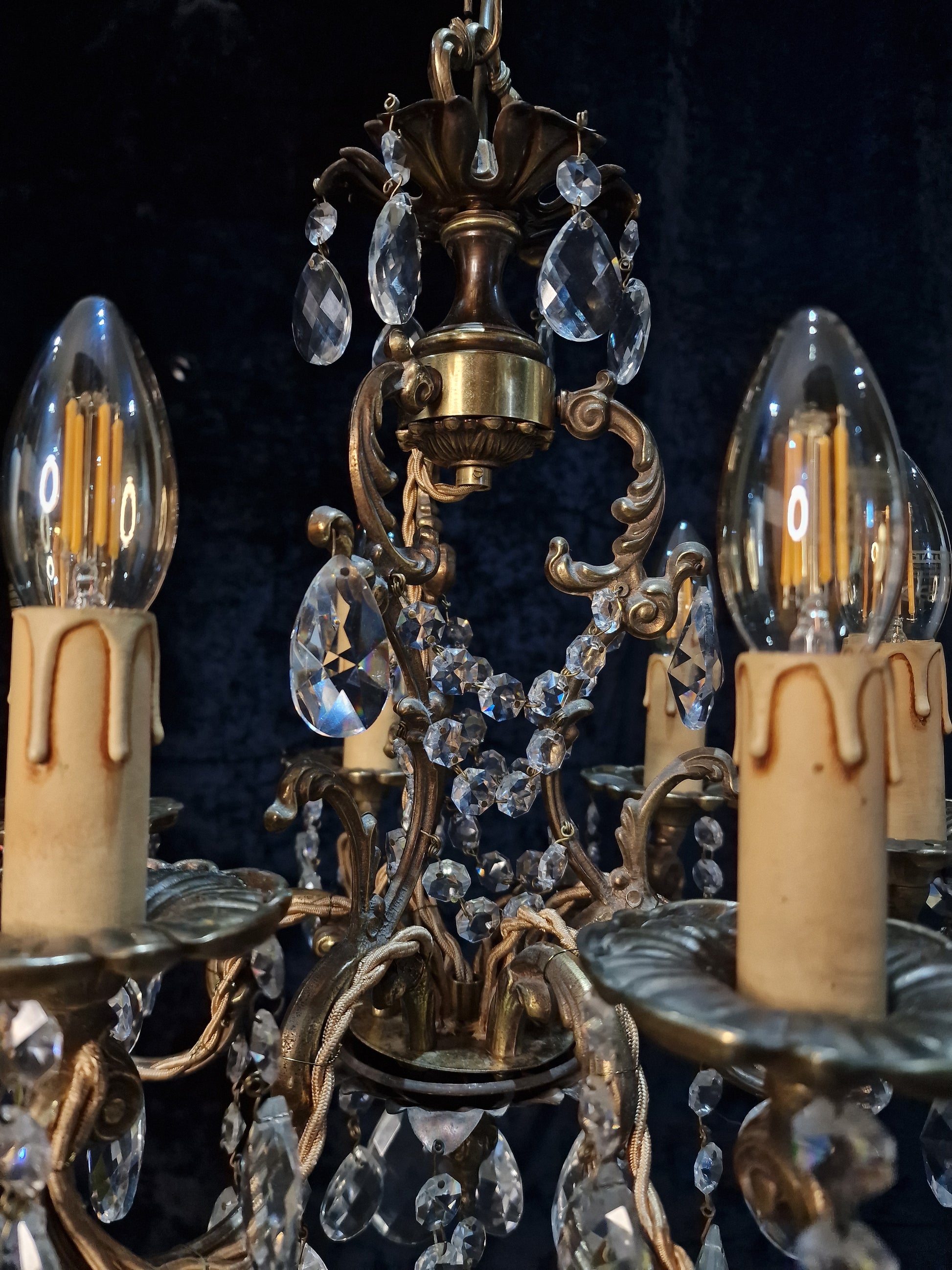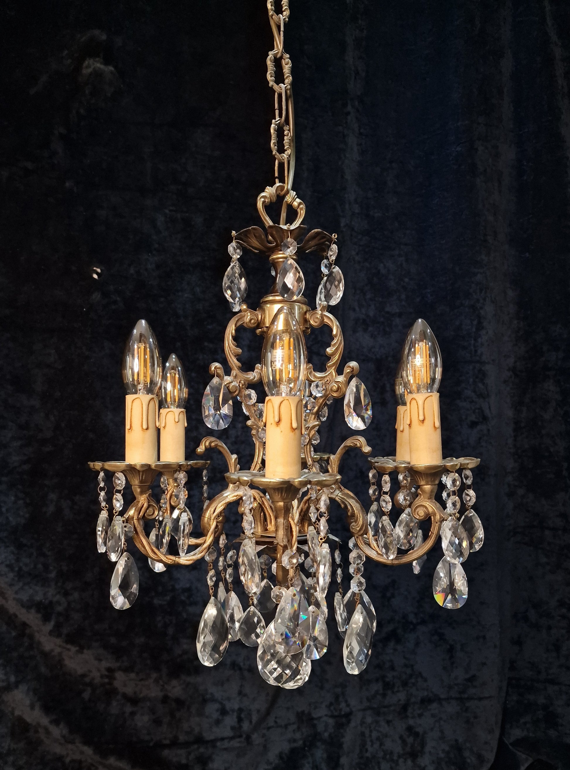 Beautiful Vintage French 6 Arm Brass Caged Crystal Chandelier Ceiling Light