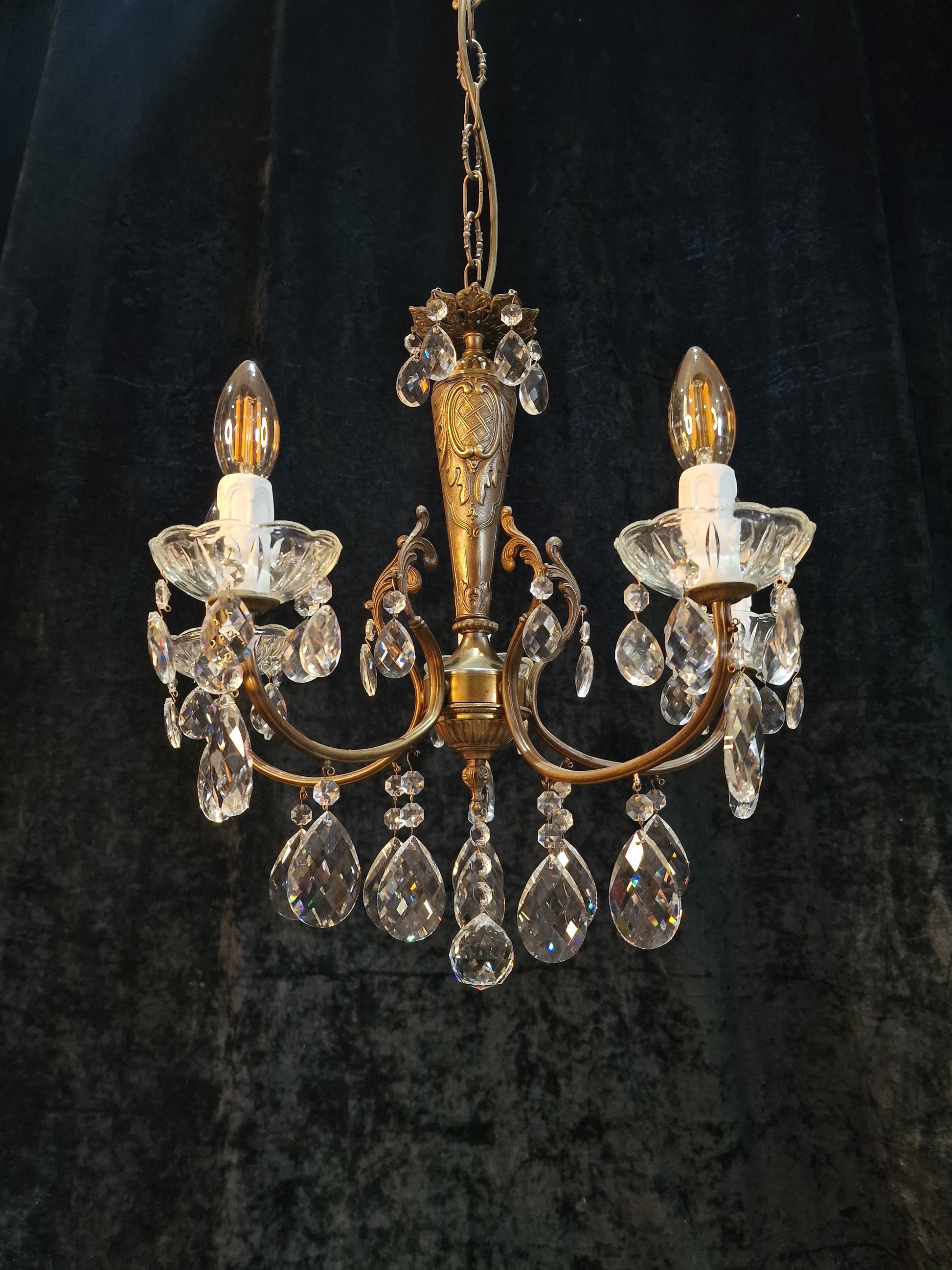 The Chandelier is in Good Condition with its original aged patina to the brass complete with glass crystal droplets and a centre glass crystal ball.