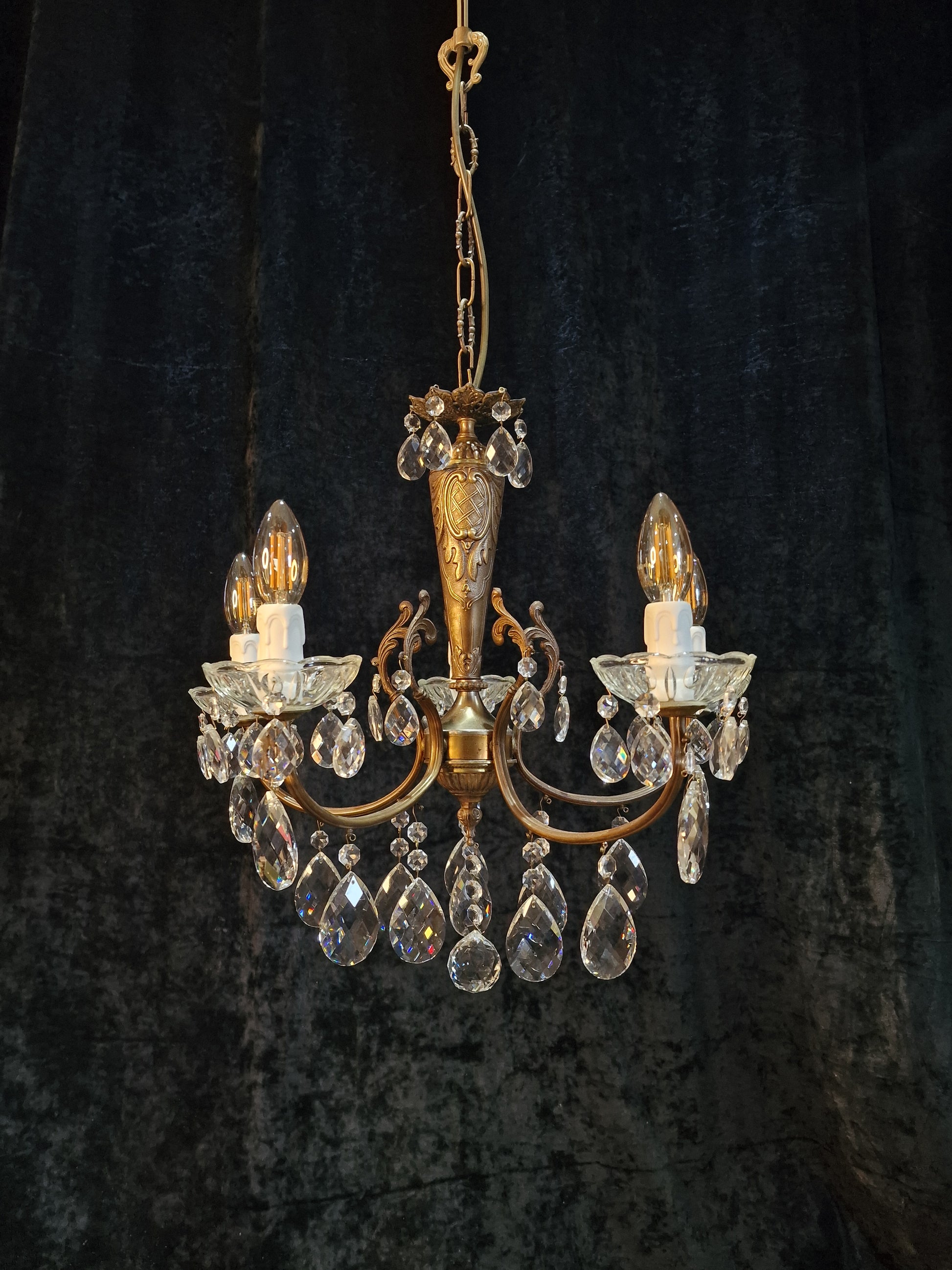Lovely Elegant Vintage Italian 5 Arm Brass Crystal Chandelier Ceiling Light