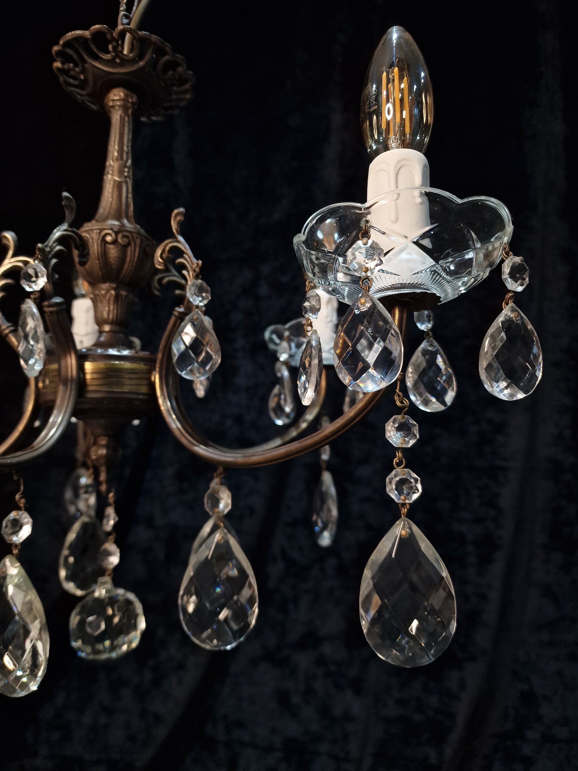 The chandelier is complete with a beautiful variety of original glass faceted crystals, glass crystal ball and glass bobeche dishes.