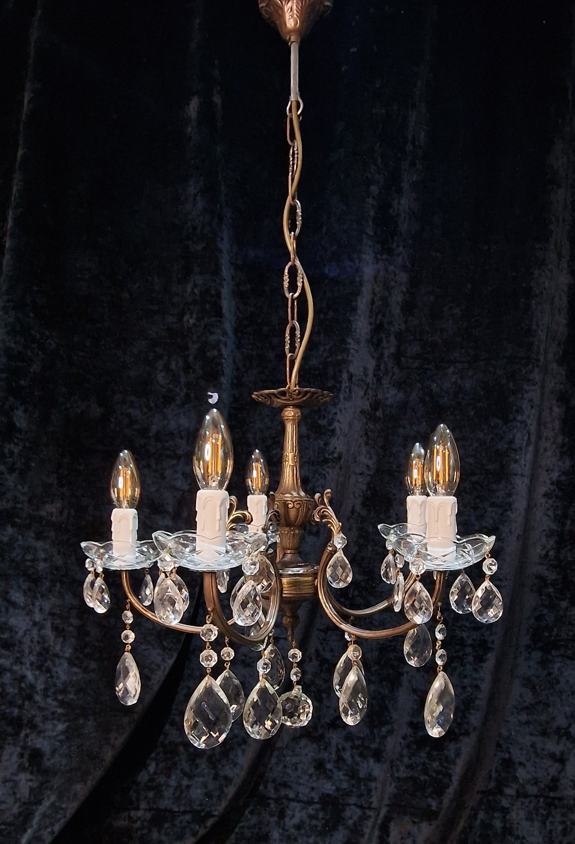 Lovely Elegant Vintage Italian 5 Arm Brass Crystal Chandelier Ceiling Light