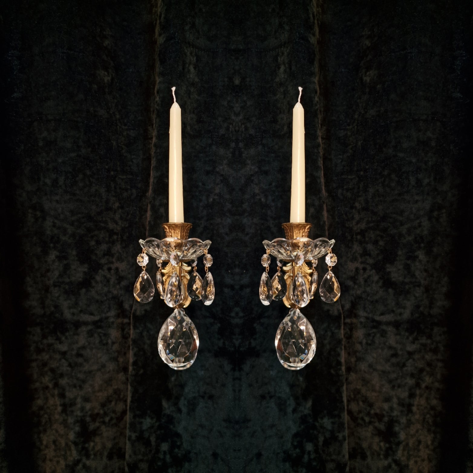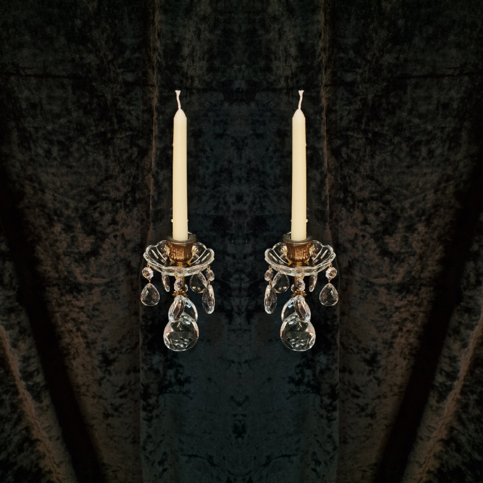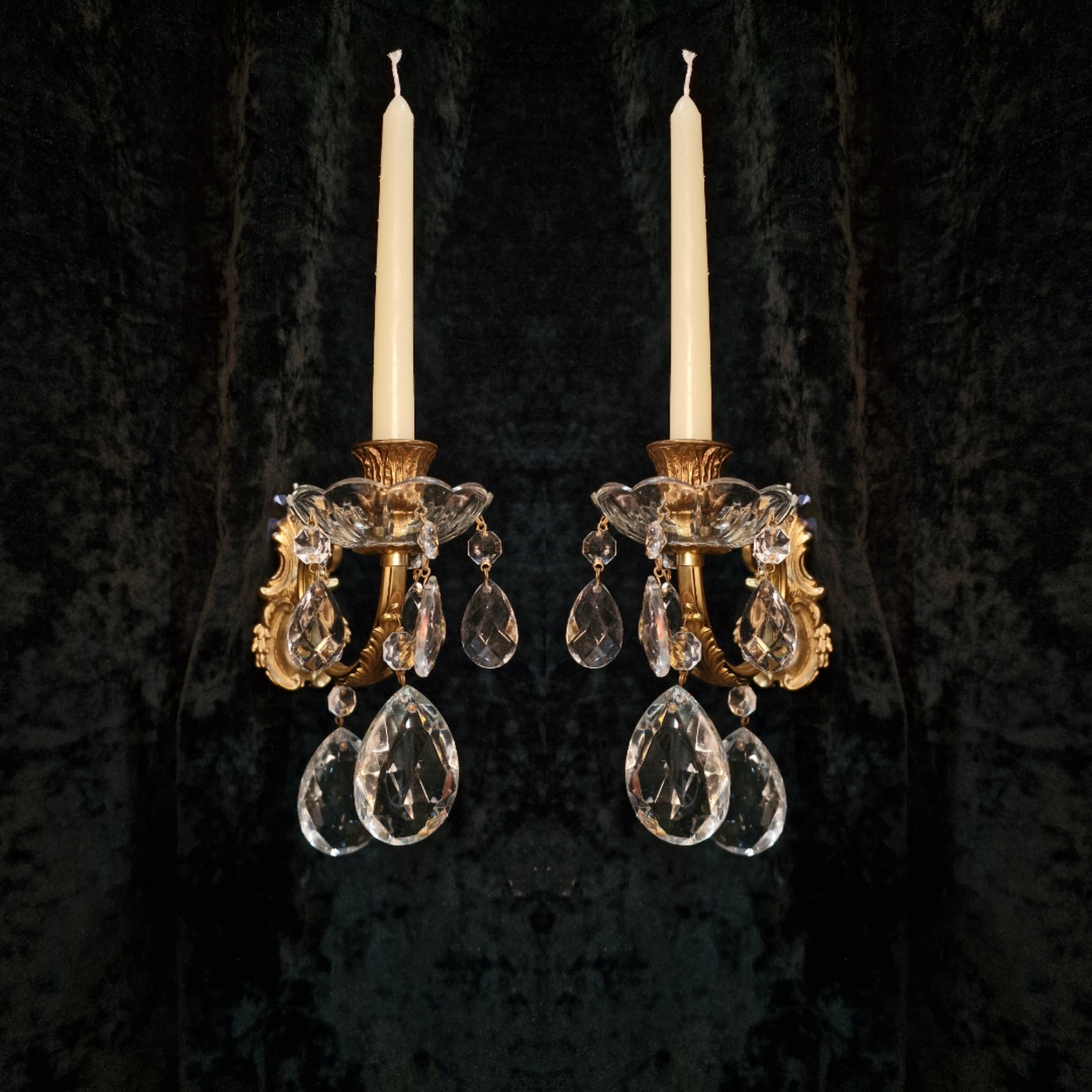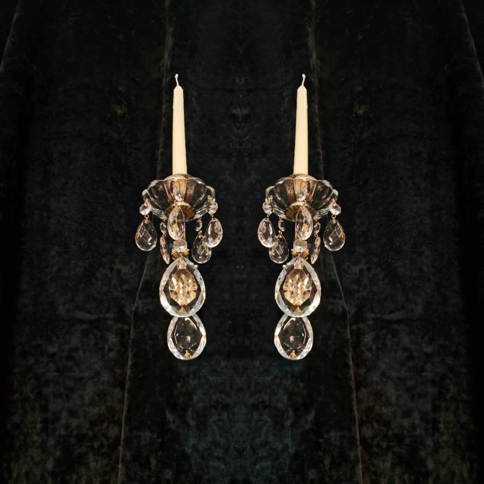 These sconces are in lovely condition for their age with no damage and come complete with glass crystals and glass bobeche dishes.