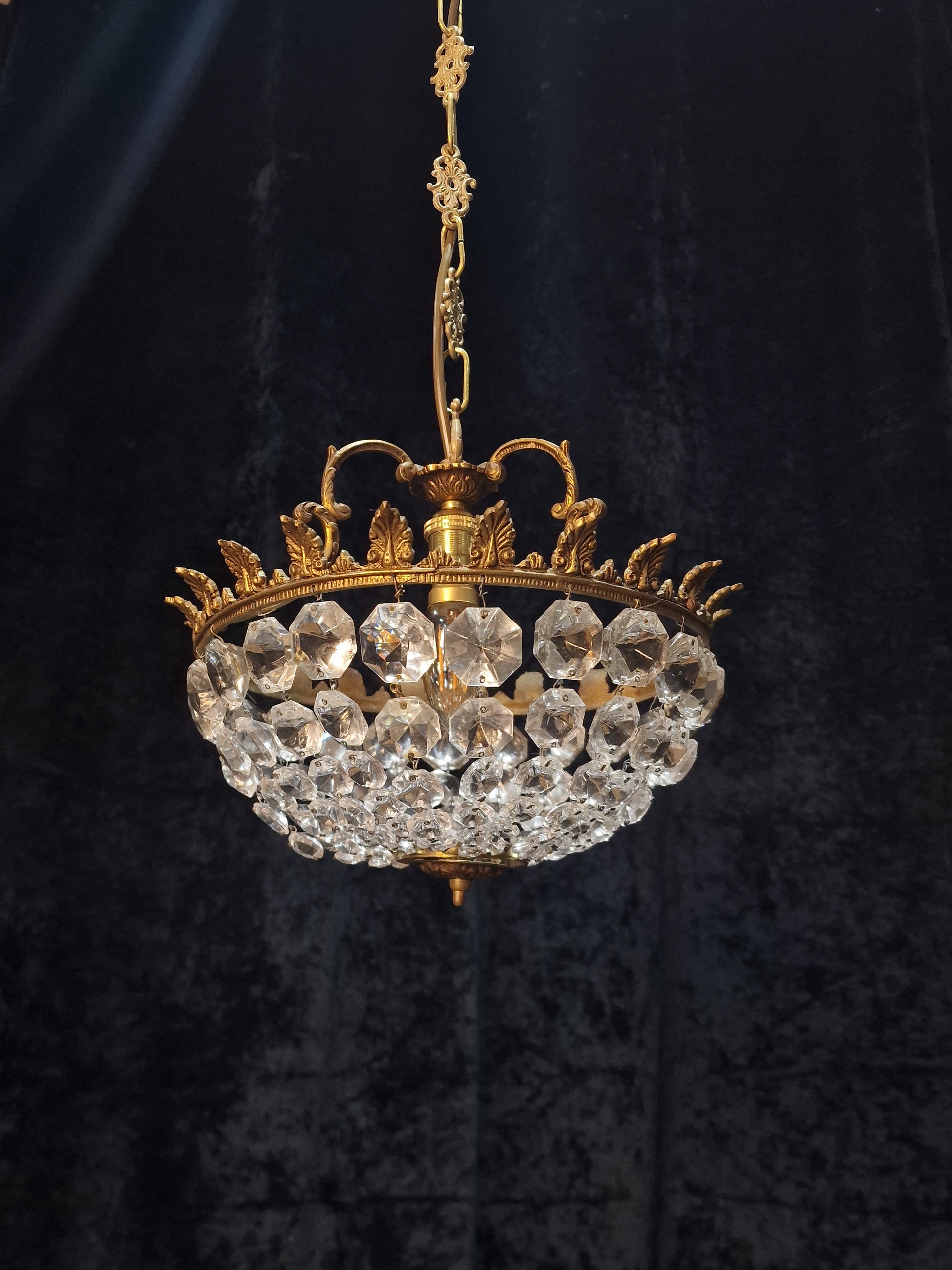 Lovely Vintage French 1 Light Half Bag Crystal Basket Brass Chandelier Light