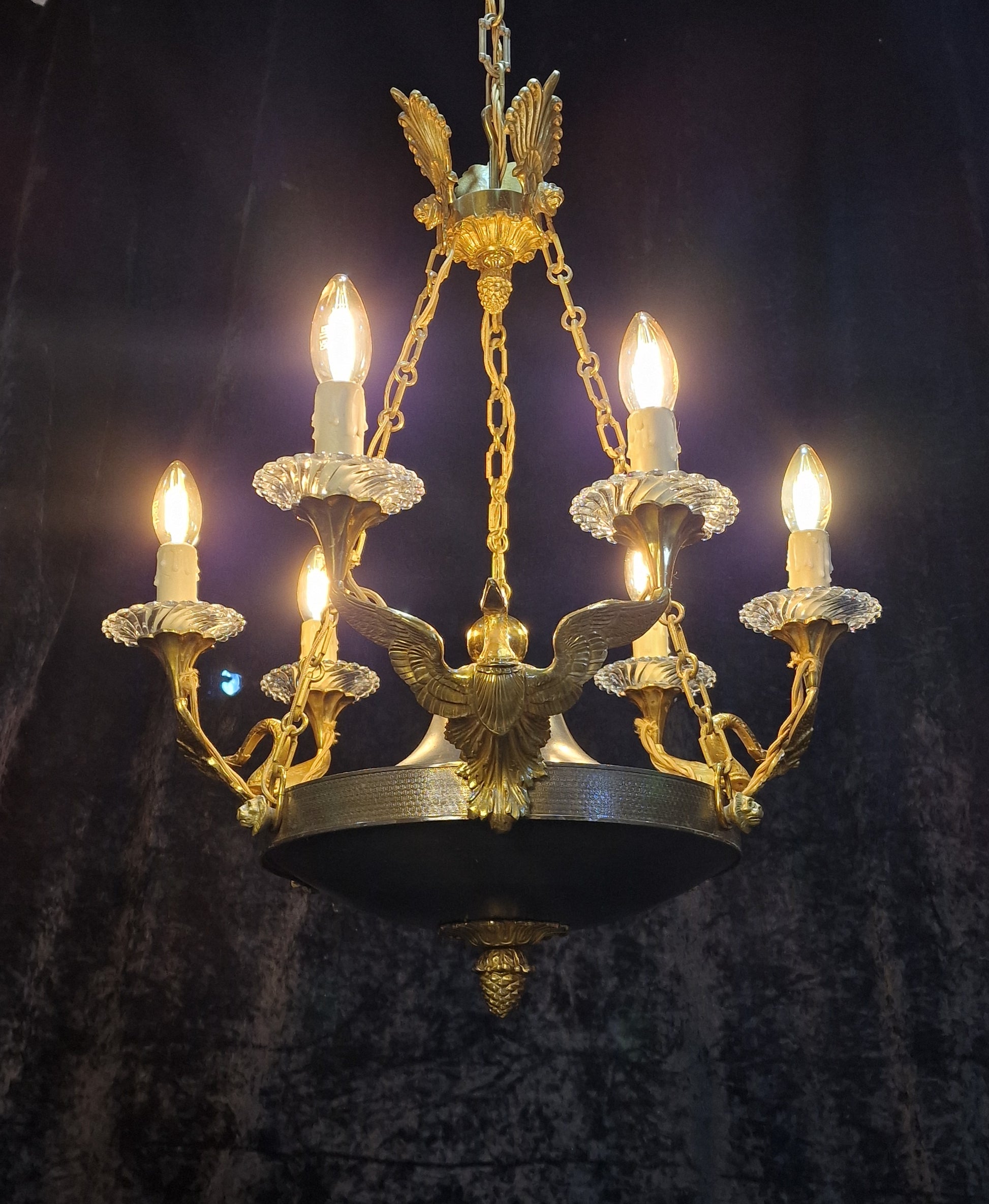 The Chandelier is in Good Condition for its Age and Complete with 6x Glass Bobeche Dishes, with No Damage. There is Scratches/Marks to the Green Patina to the Centre Body of the Chandelier. - Normally Expected with Older Empire Chandeliers.