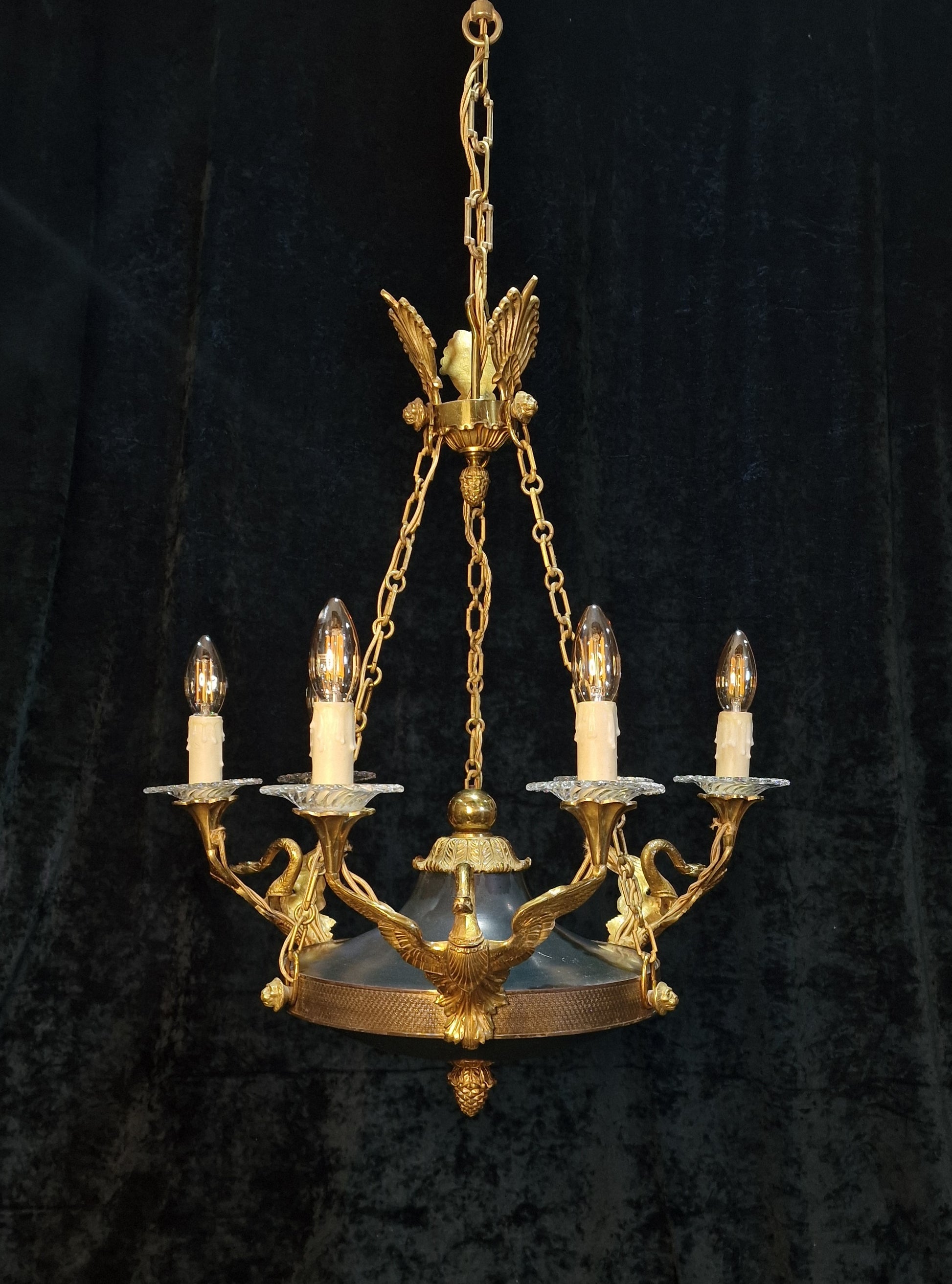 In the Typical Empire Style with 3x Solid Brass Swans which Carry 2 Lights Each, and Solid Brass Lion Head Embellishments Where the 3x Chains Sit.
