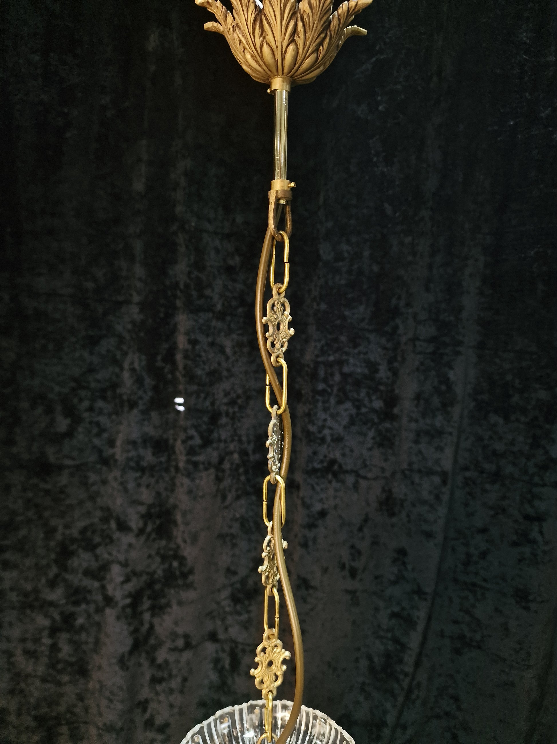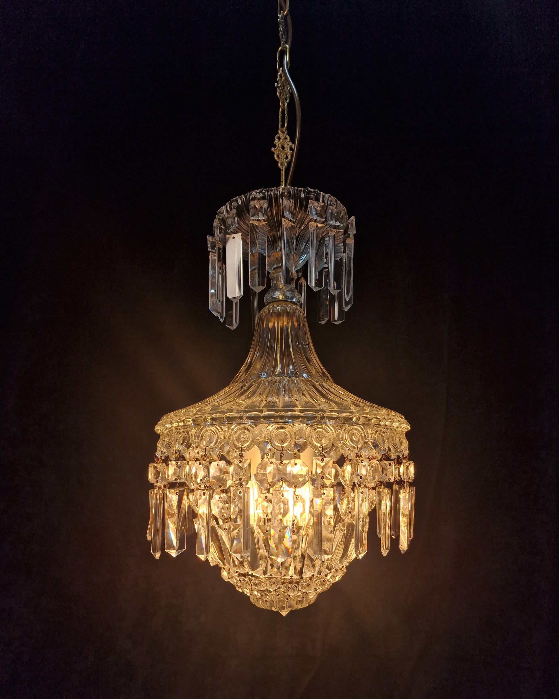 The Chandelier is in Good Condition for its age with a decorative brass chain and ceiling rose. This chandelier is also complete with no missing pieces or crystals.