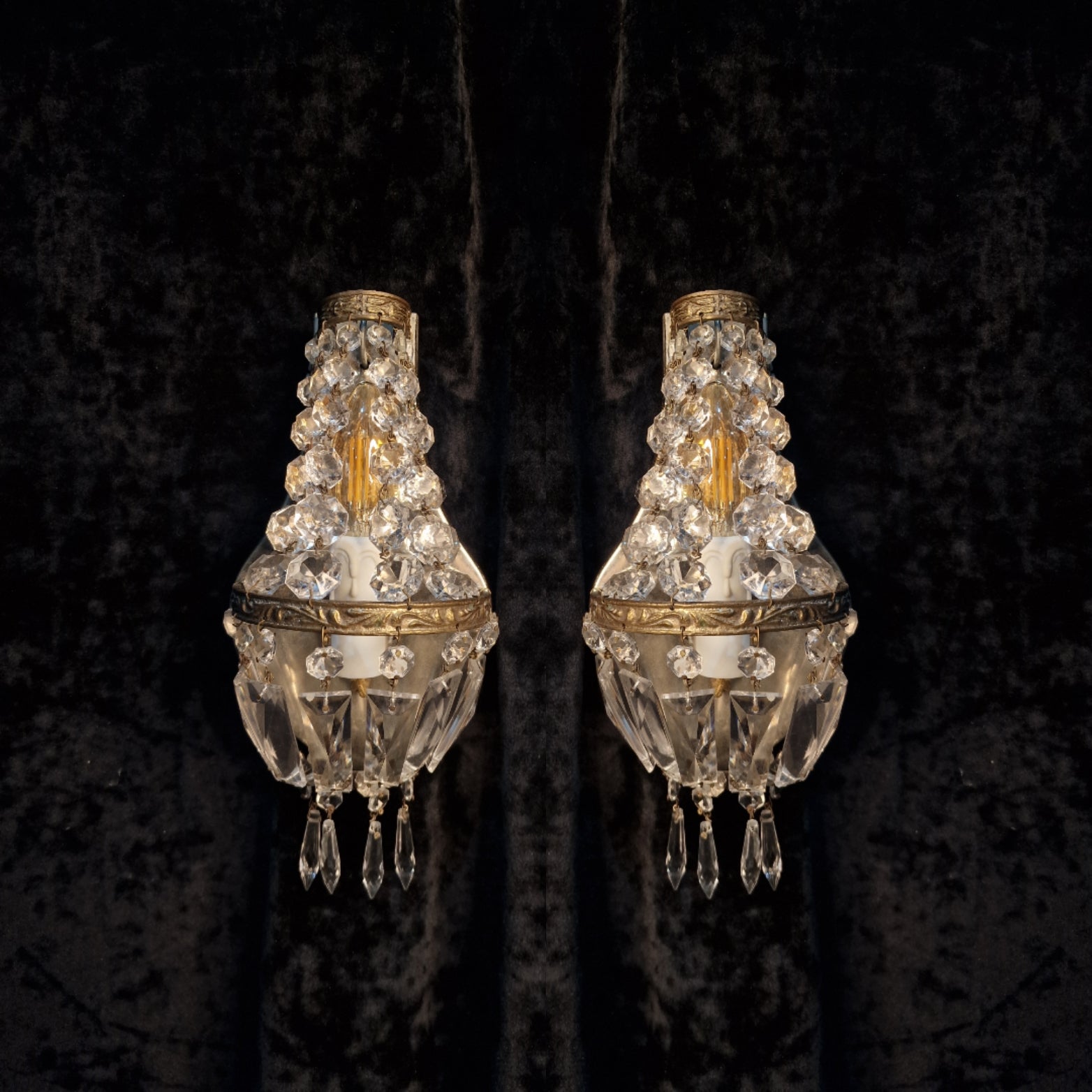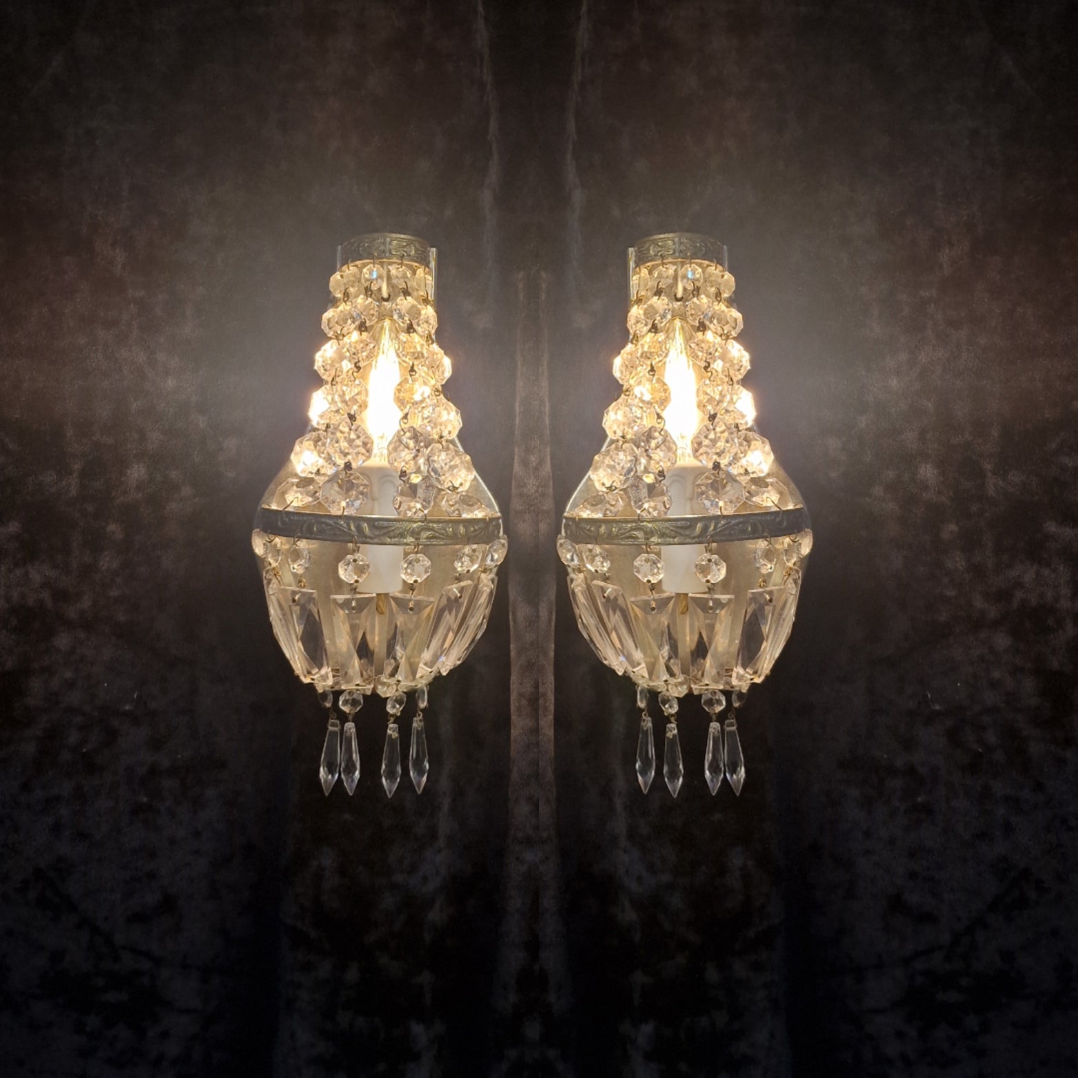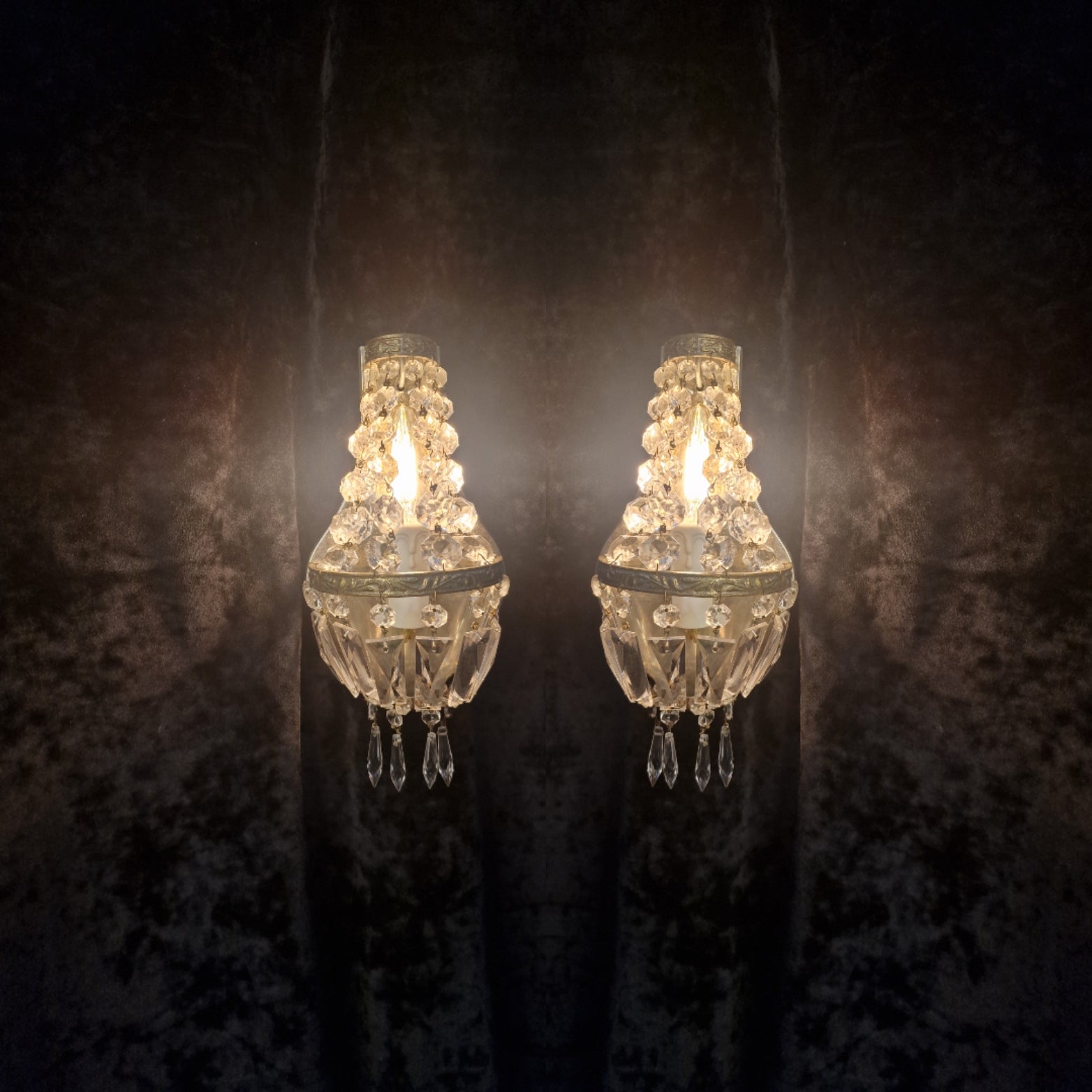These sconces are in lovely condition for their age, and come complete with their original glass crystals, and reflective metal backplates.