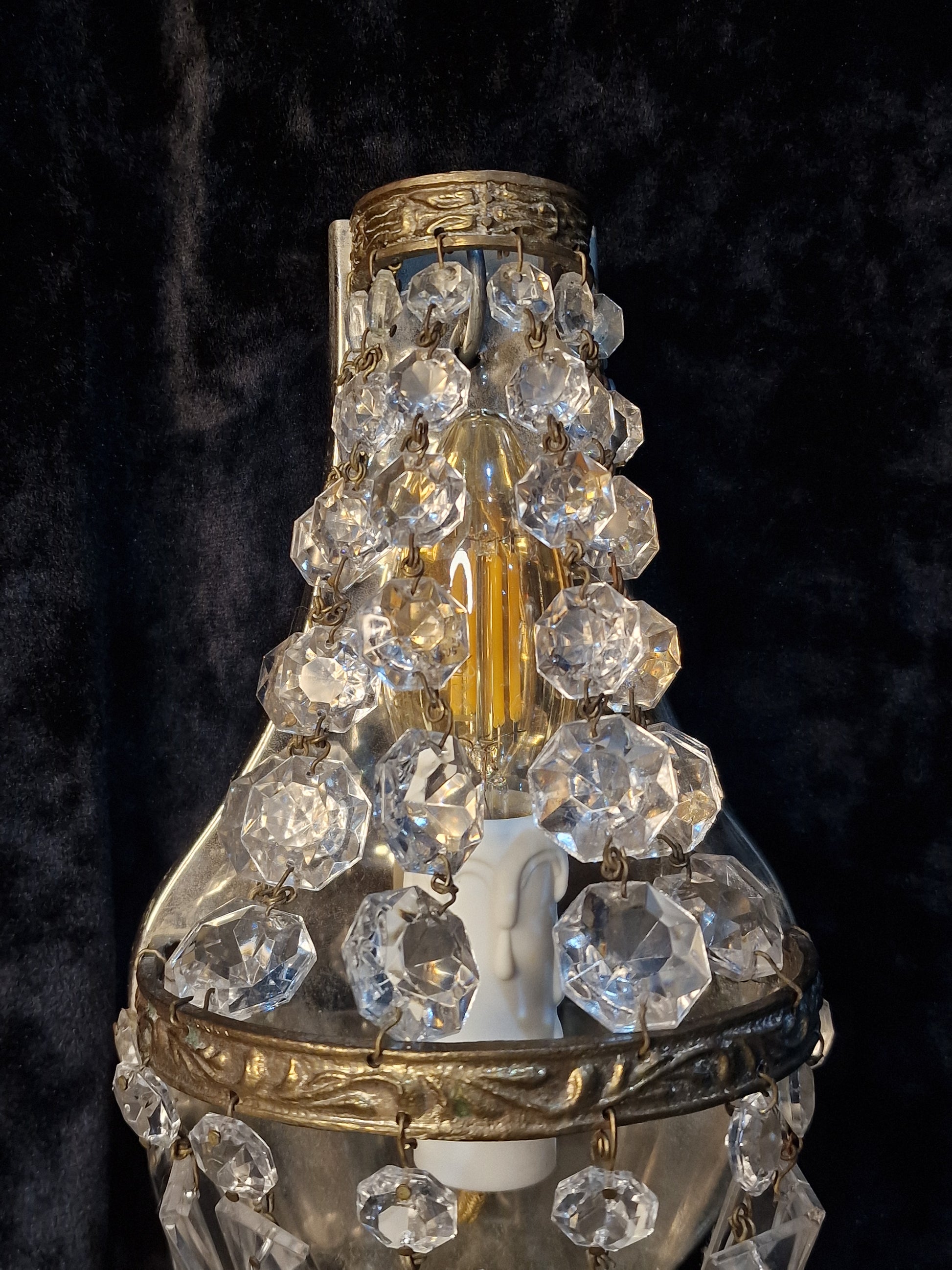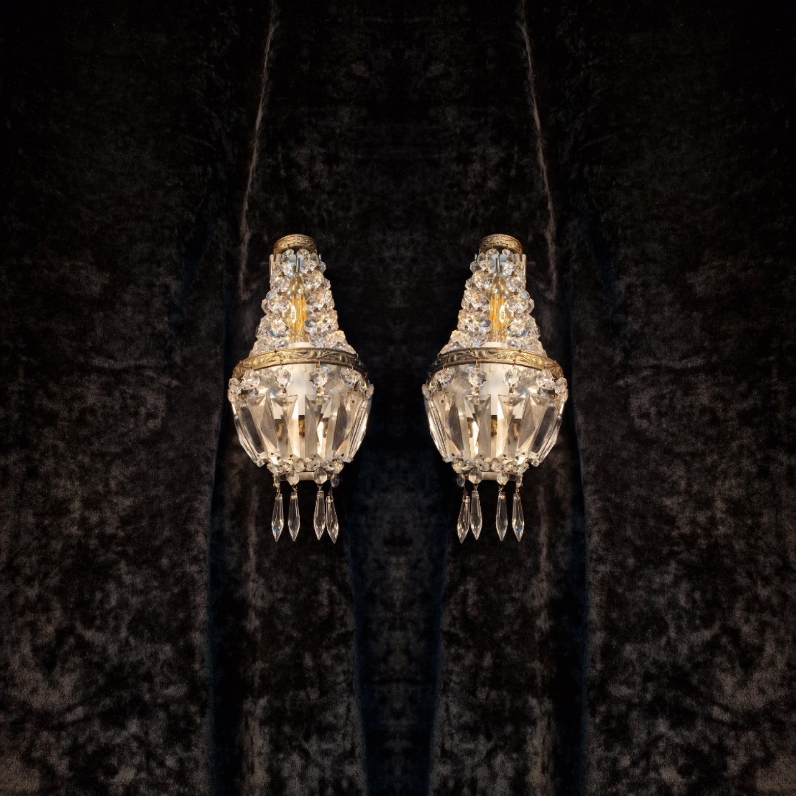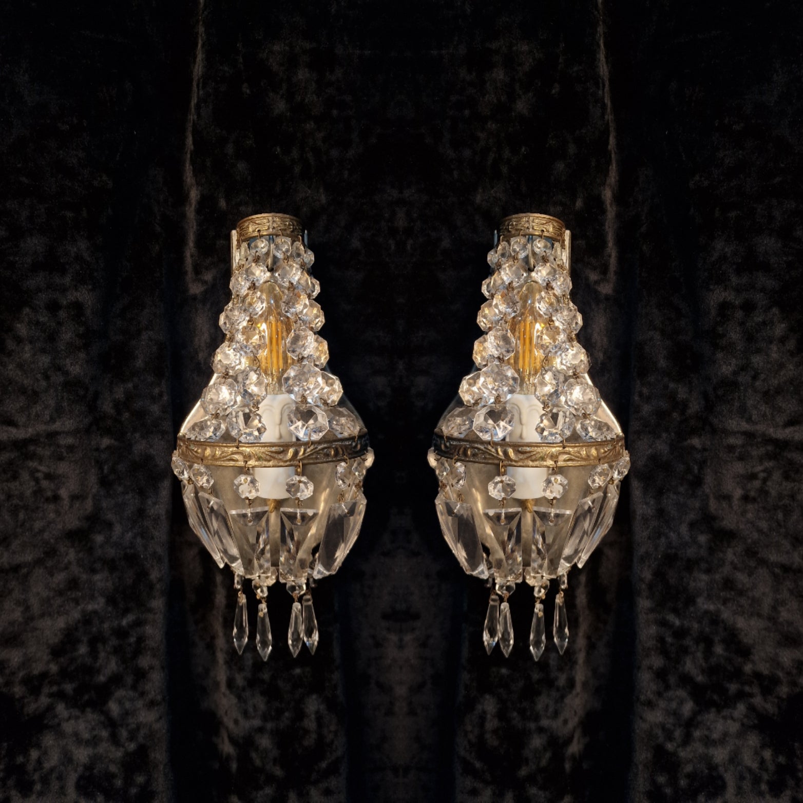 These sconces are in lovely condition for their age, and come complete with their original glass crystals, and reflective metal backplates.