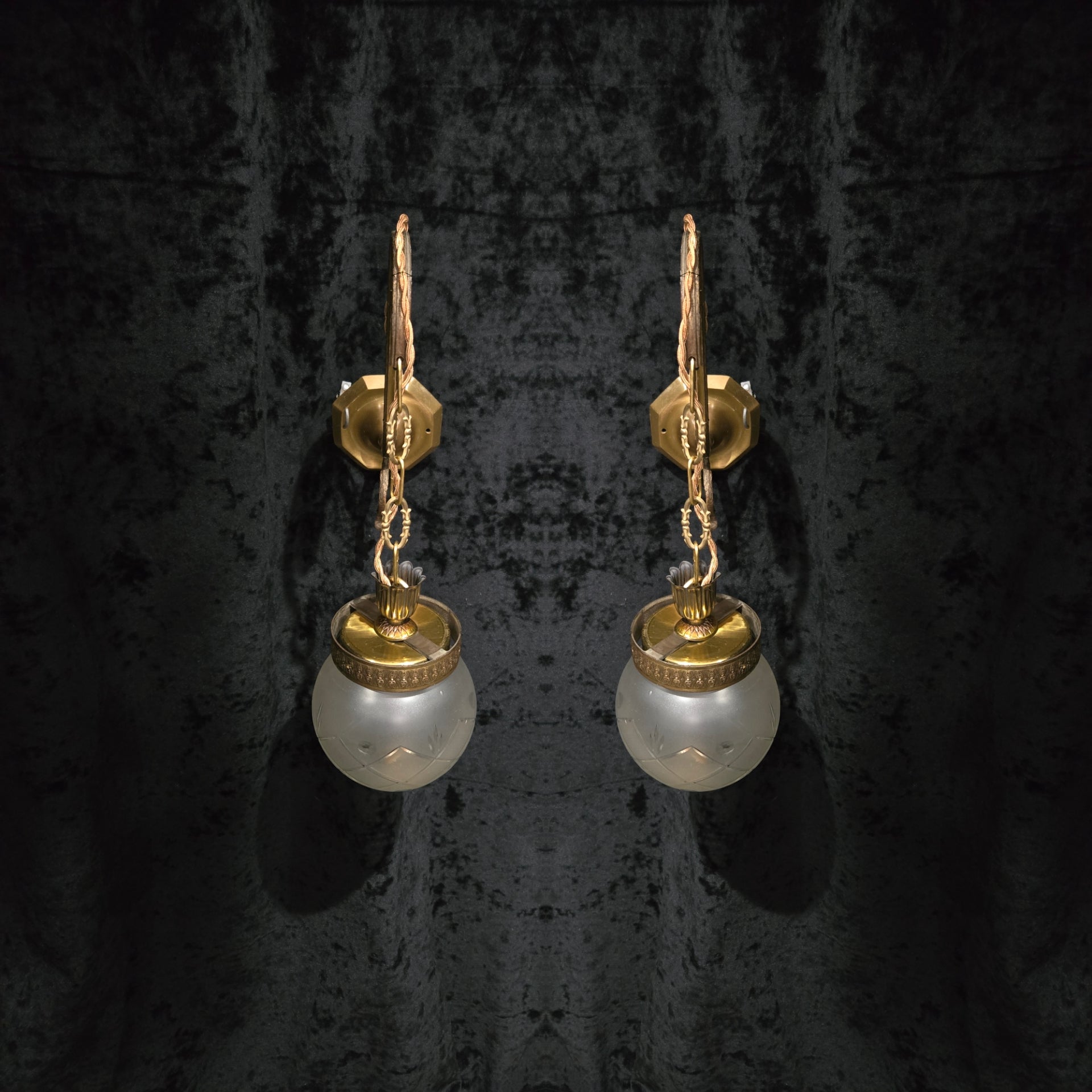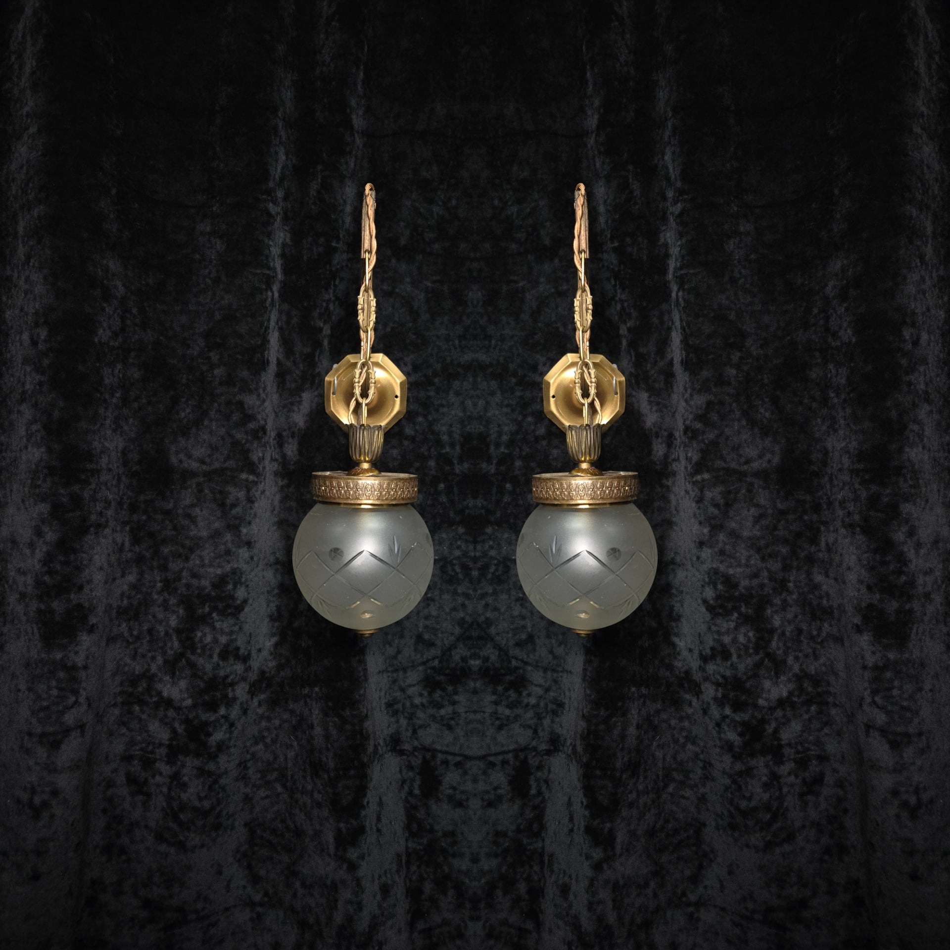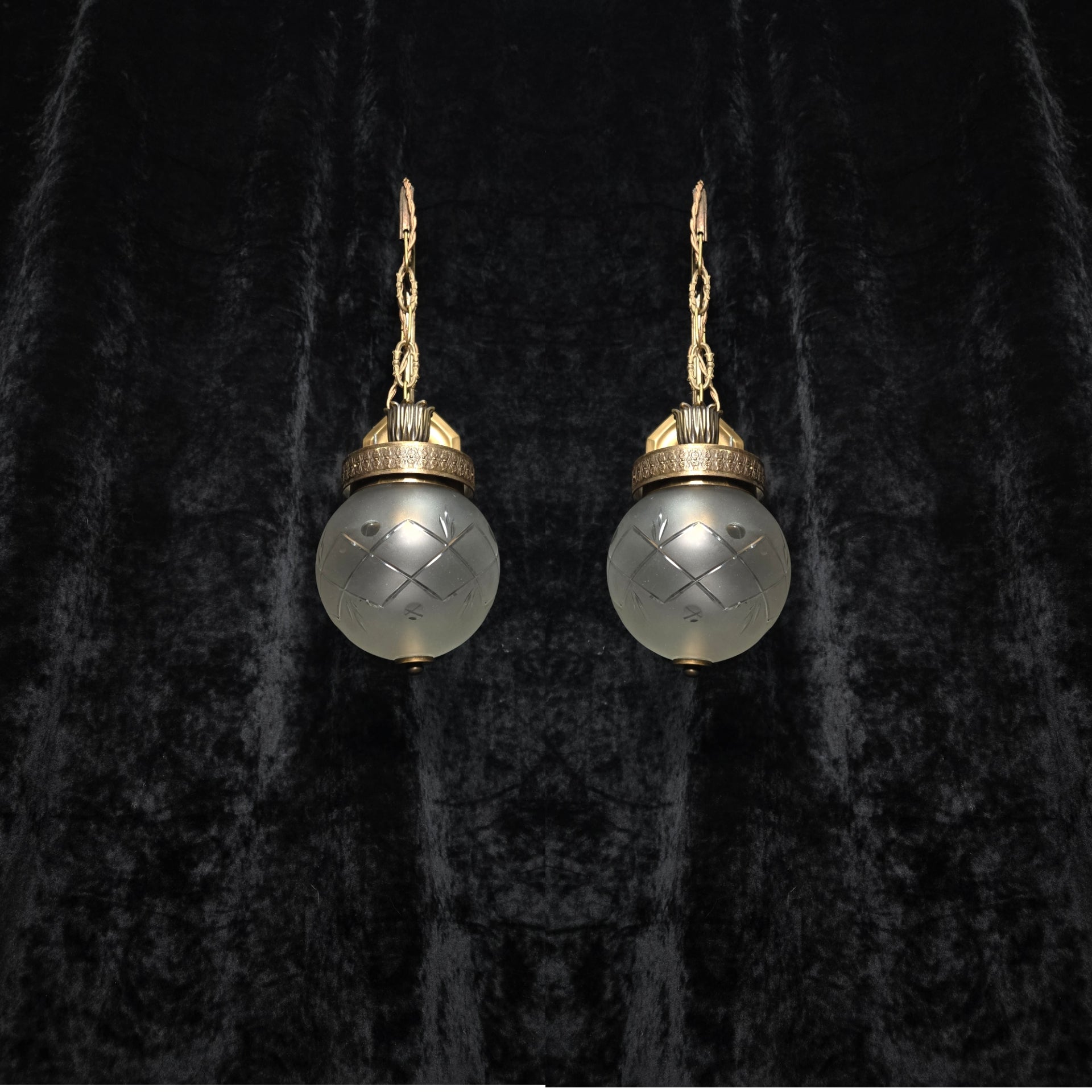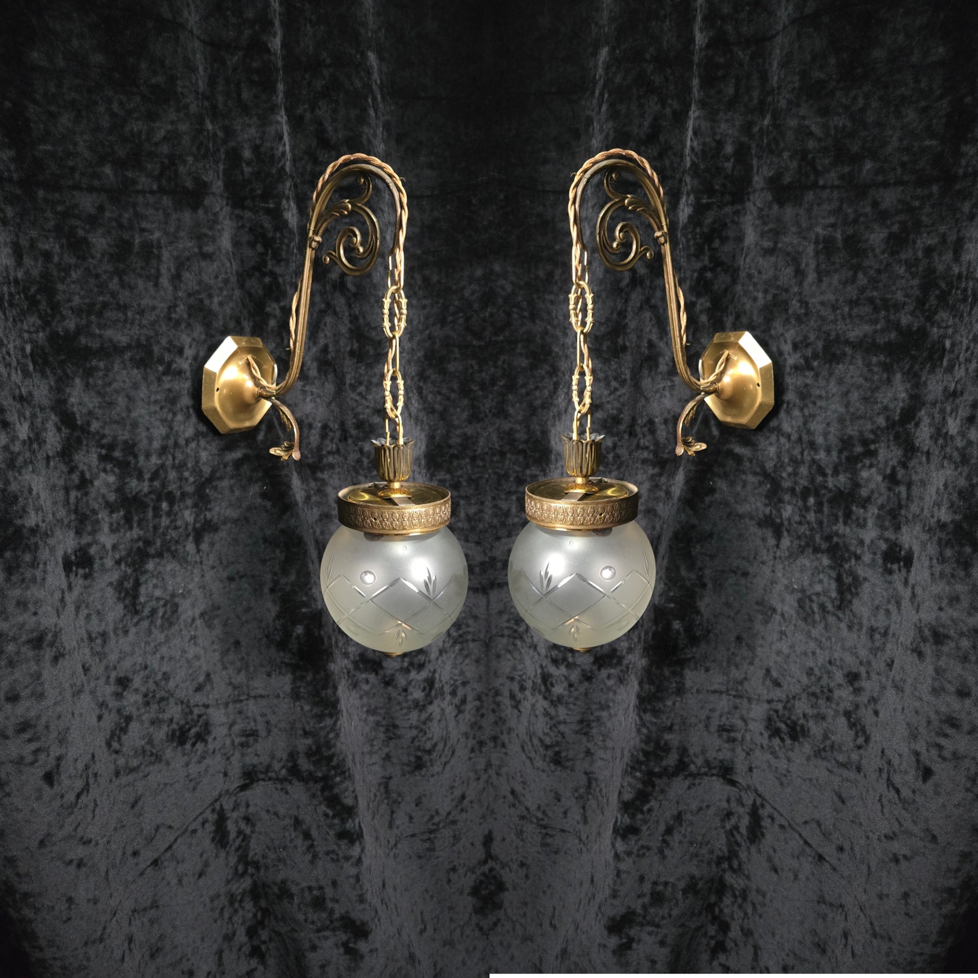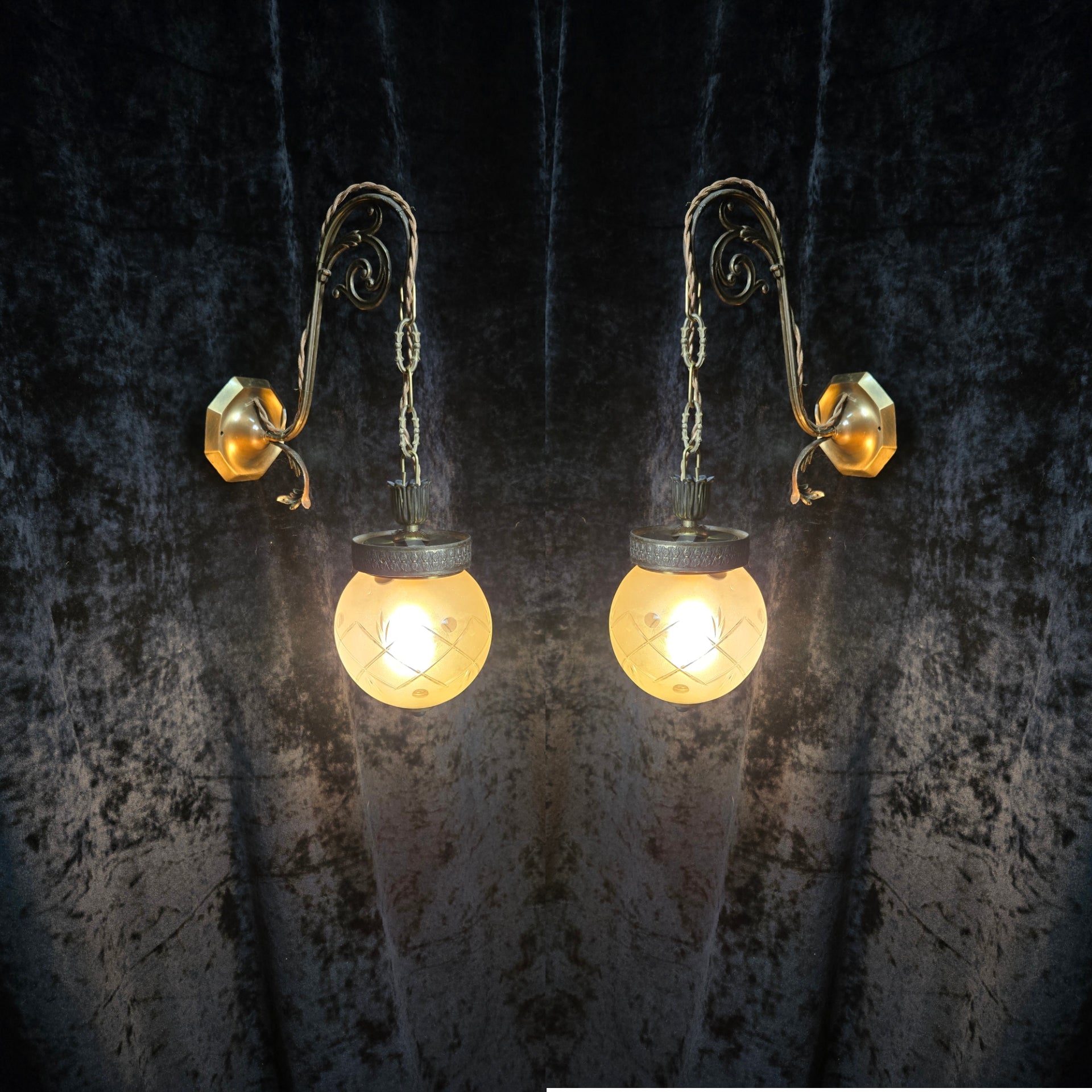 They are complete with vintage cut glass frosted globe shades which have brass button finials underneath and simply clip in situ onto the galleries.