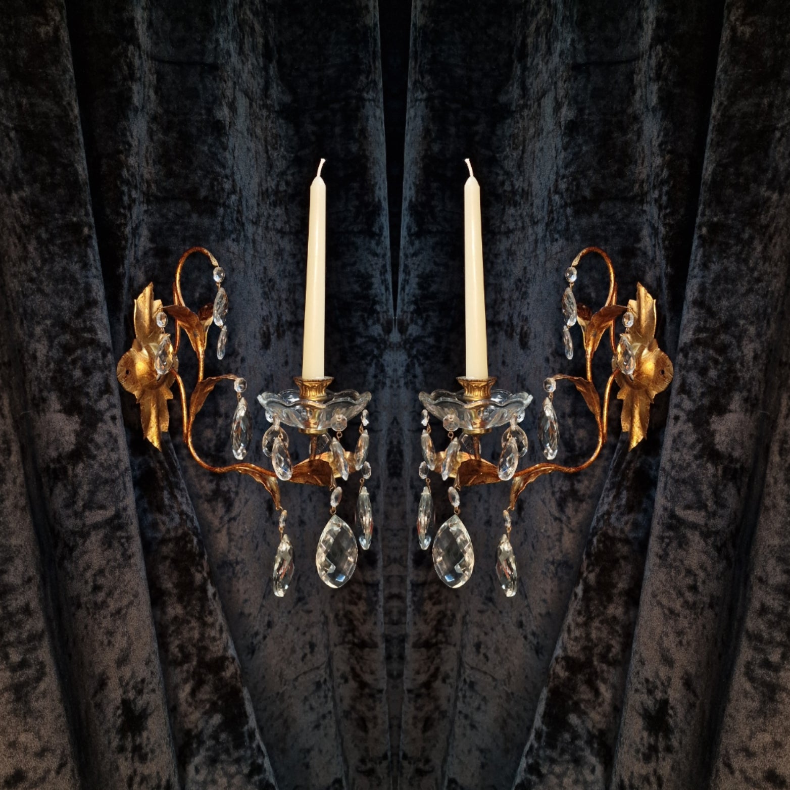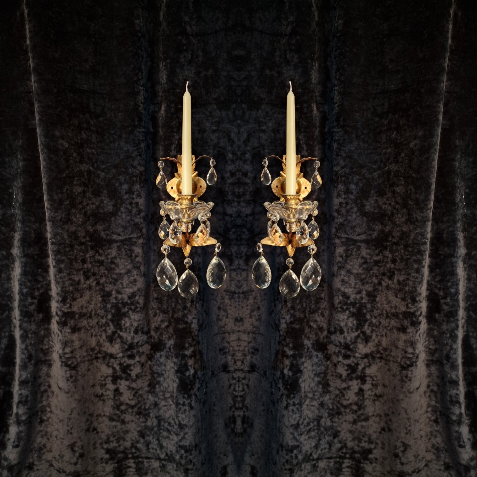 These sconces are in lovely condition for their age with no damage and complete with a lovely variety of faceted glass crystals and glass bobeche dishes.